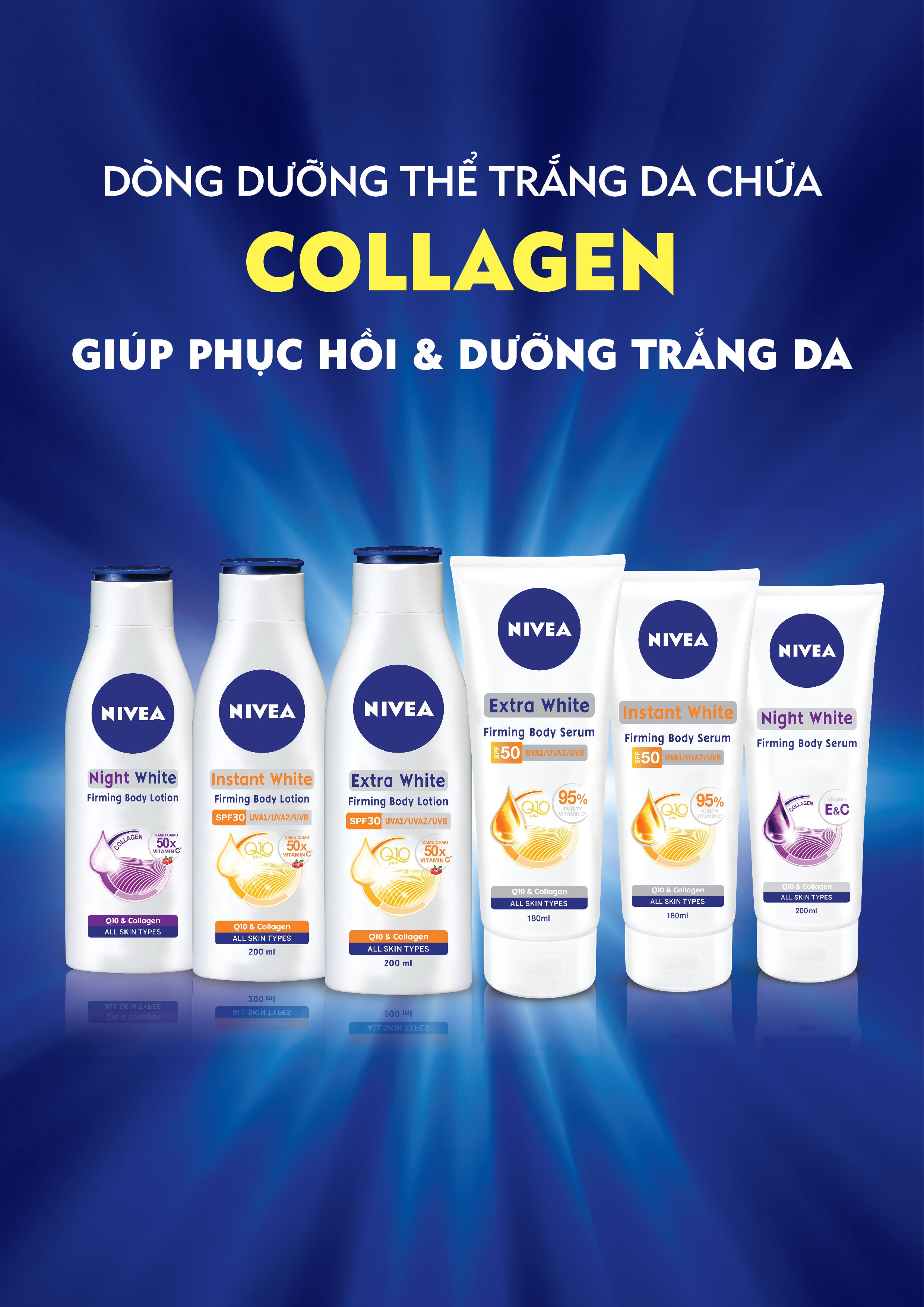 Dòng dưỡng thể trắng da chứa collagen từ NIVEA bao gồm: - Sữa dưỡng thể trắng da SPF 30, sữa dưỡng thể trắng da ban đêm và sữa dưỡng thể trắng tức thì SPF 30: cho da sạm đen và hư tổn ít.