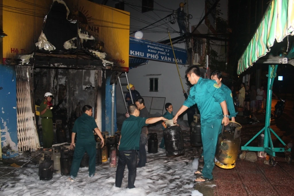 Công an phường, dân phòng triển khai ổn định tình hình. Lực lượng PCCC cũng nhanh chóng có mặt chữa cháy, phun bọt để làm mát các bình gas bên trong, tránh gây nổ và tìm cách vận chuyển ra bên ngoài.