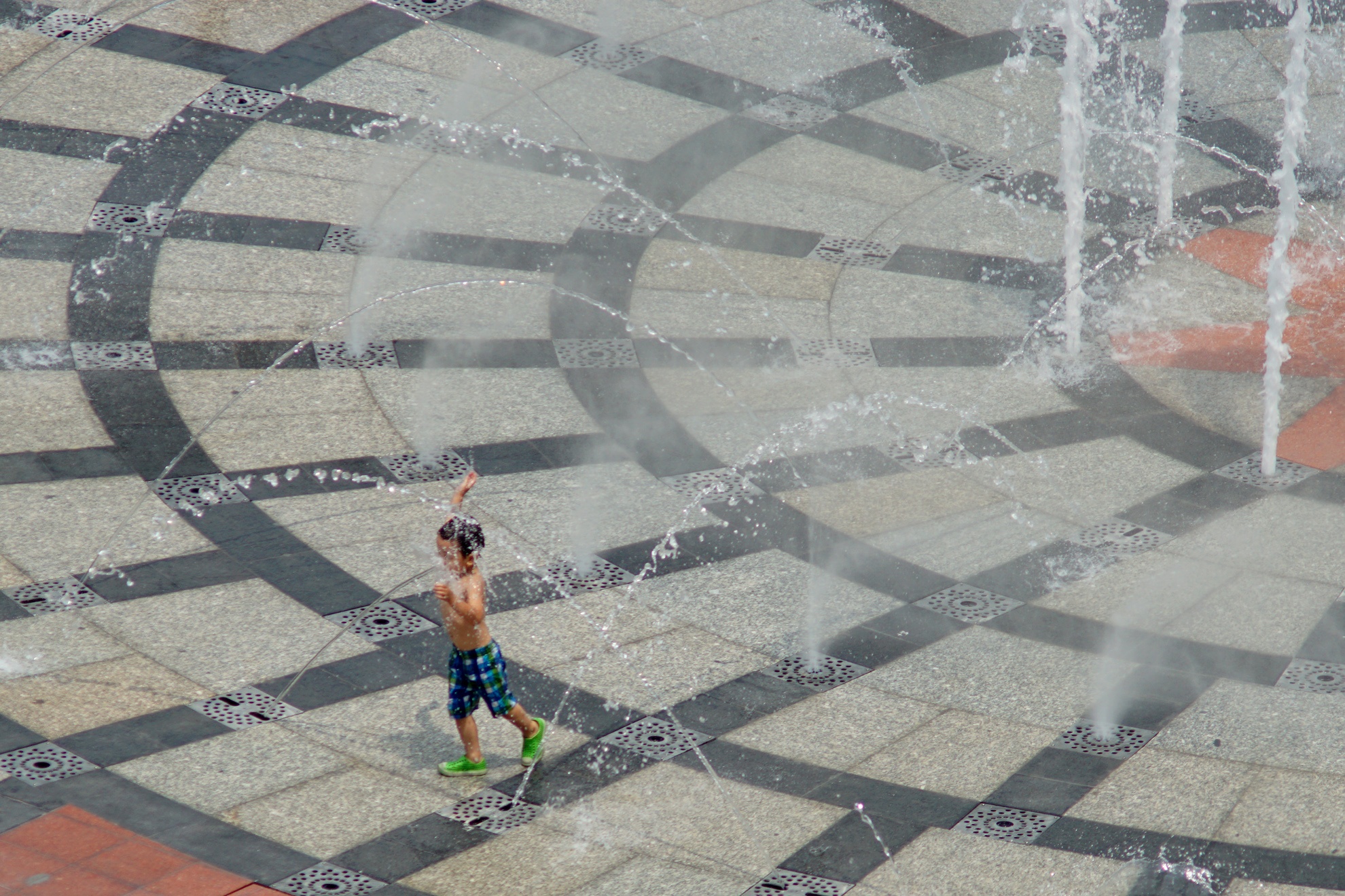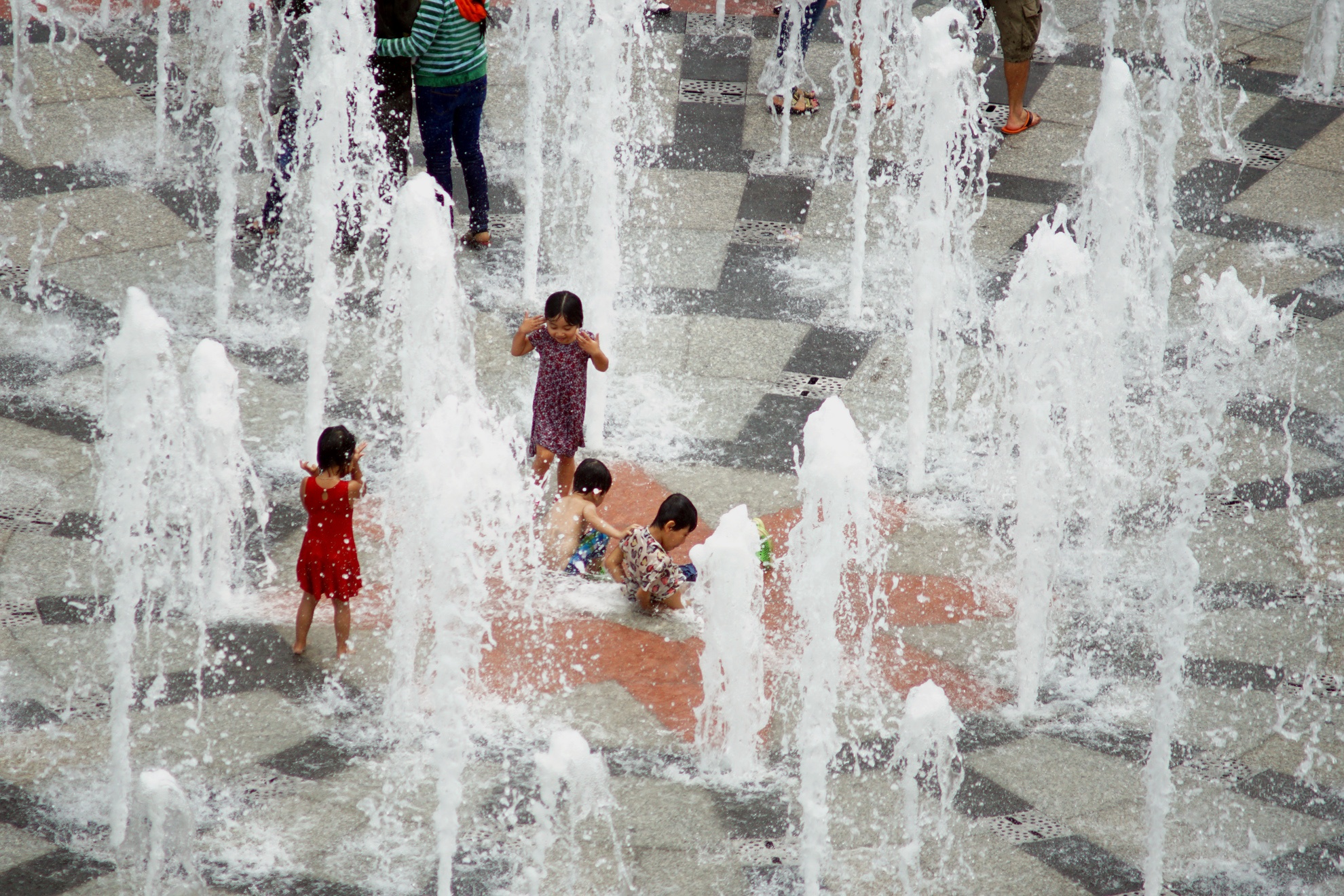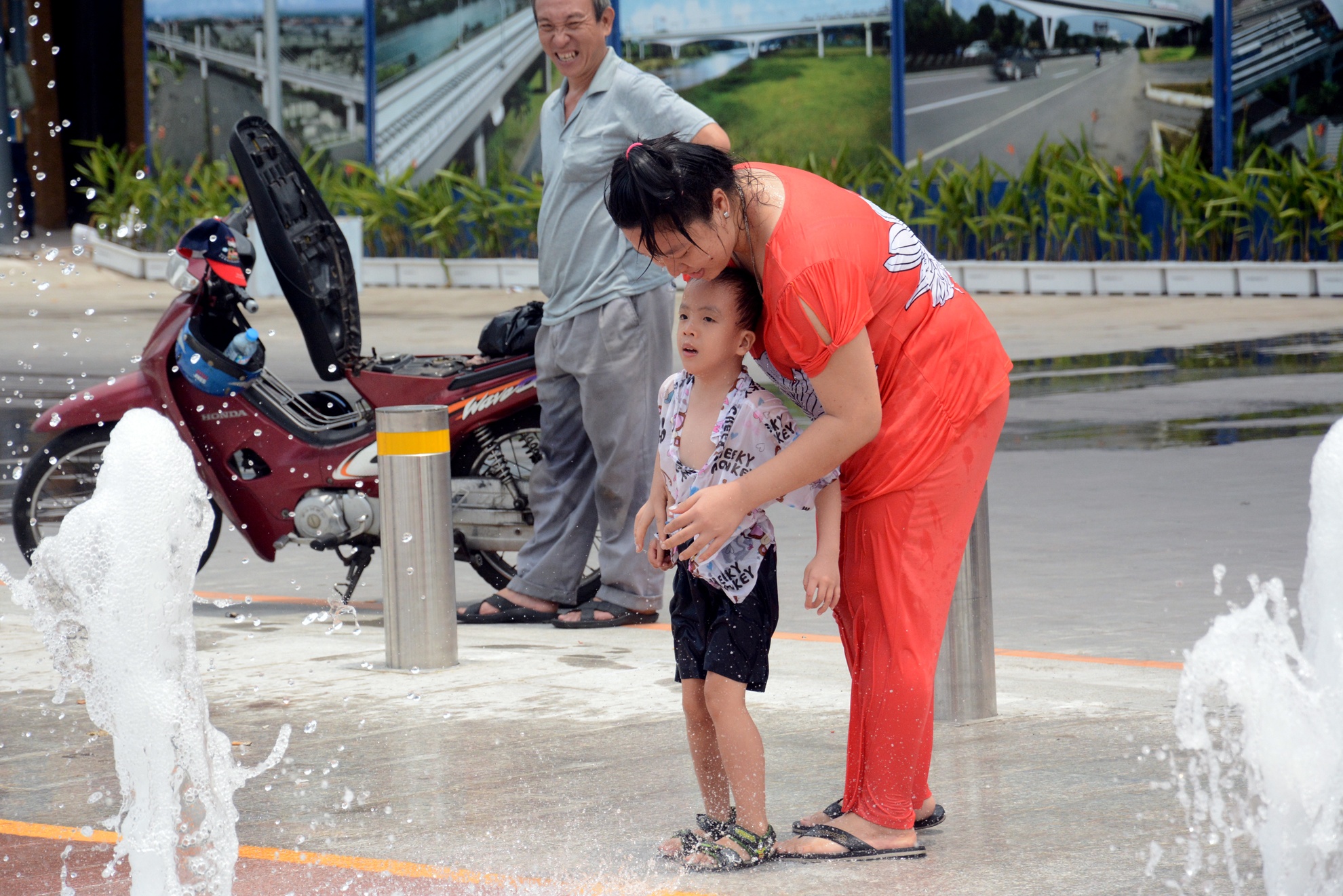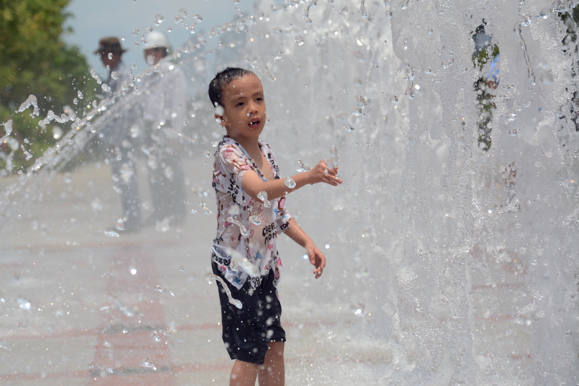 | Do không có hàng rào bảo vệ, một số trẻ em đã nhảy vào giữa đài phun nhạc nước để nghịch, sáng 29/4. |