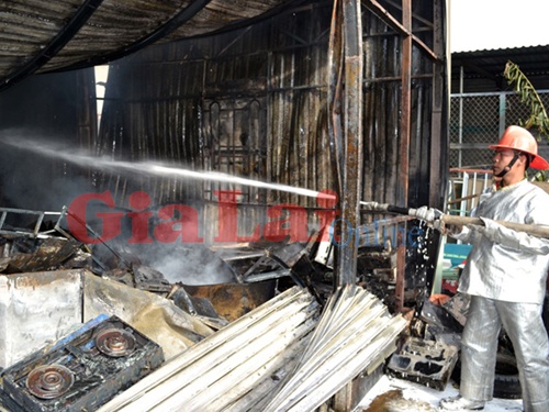 | Ngọn lửa cao hơn 30 m, thiêu rụi hoàn toàn nhà kho và các thứ bên trong nhà kho gồm hàng trăm bình gas, bếp gas, tủ lạnh, két sắt và xe ô tô. |