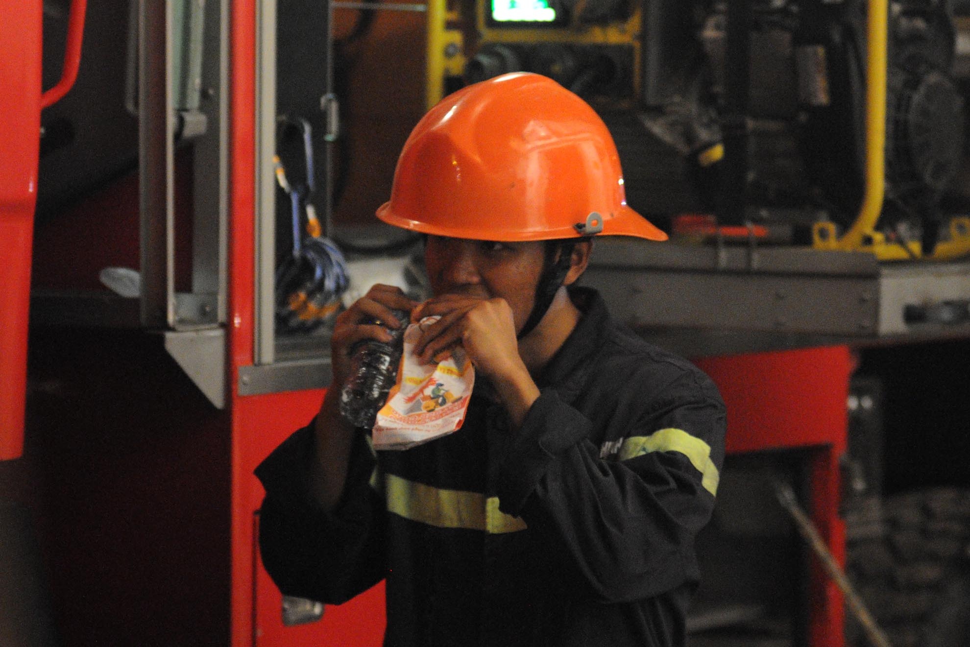 | Các chiến sĩ PCCC phải ăn tạm bánh mì để có sức làm việc. |