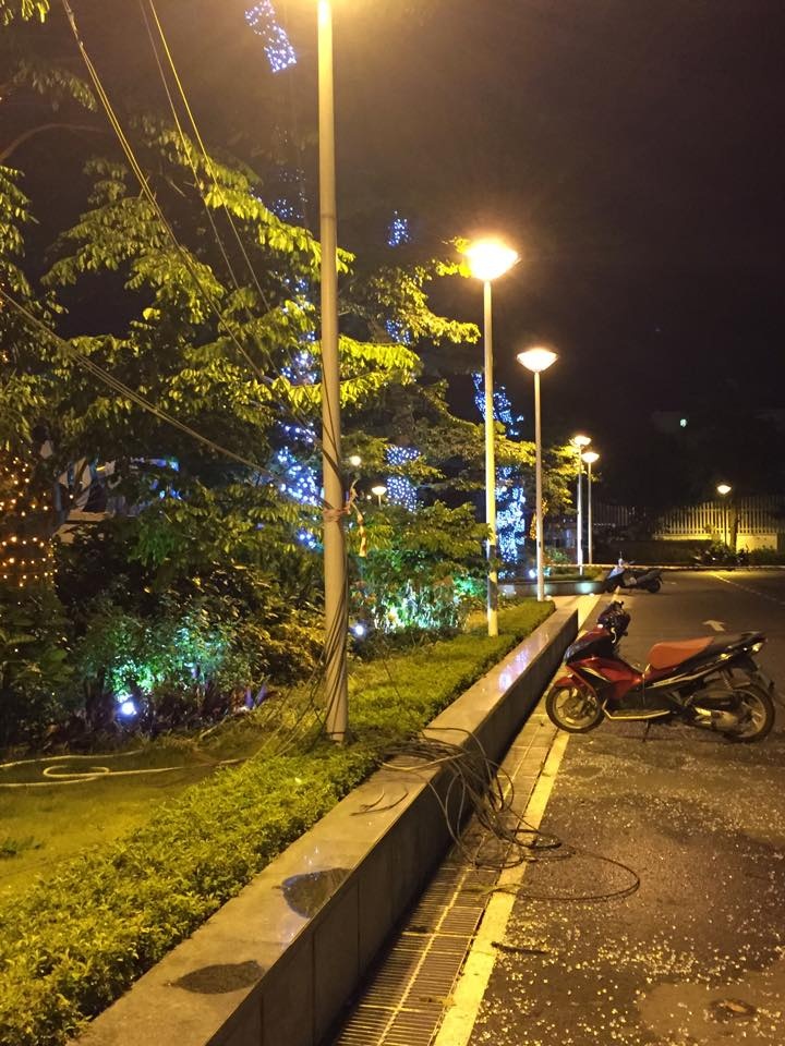 Trước tòa nhà Thăng Long 40 tầng, hệ thống đèn trang trí hỏng một phần, nhiều mảnh vỡ thủy tinh vương vãi trước sảnh và dọc đường Khuất Duy Tiến.