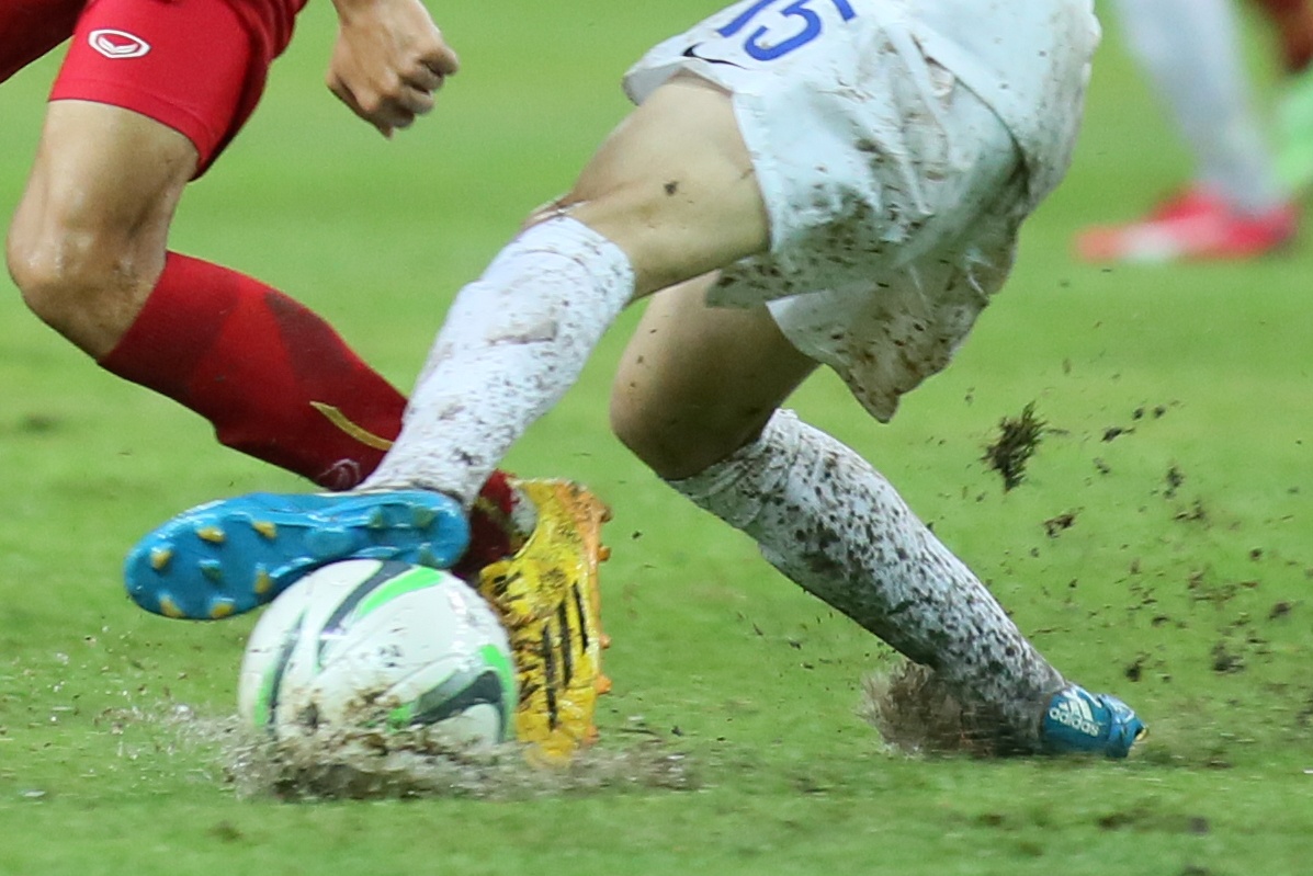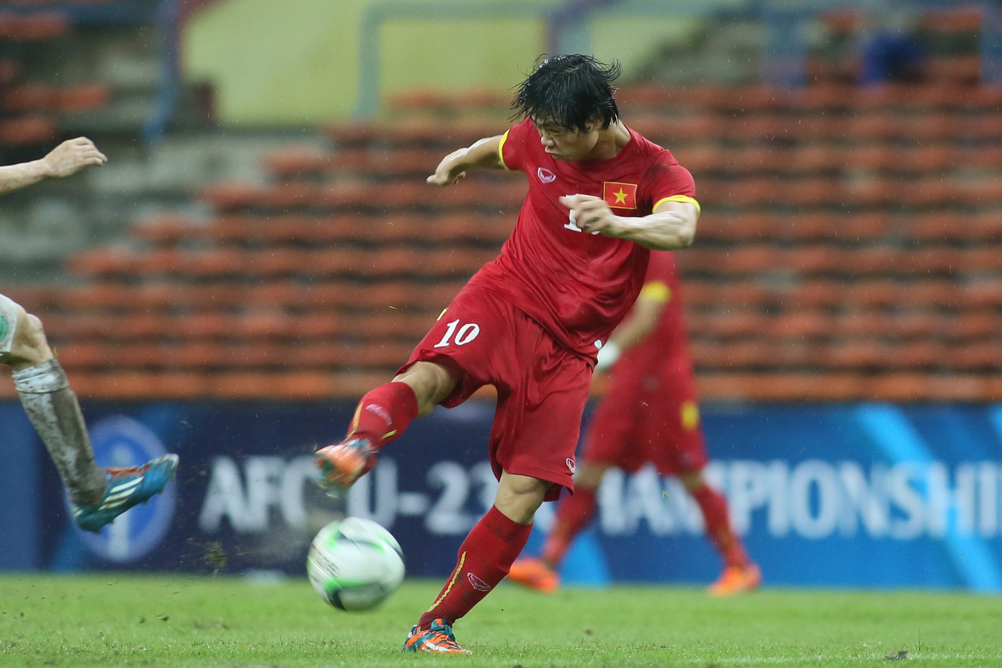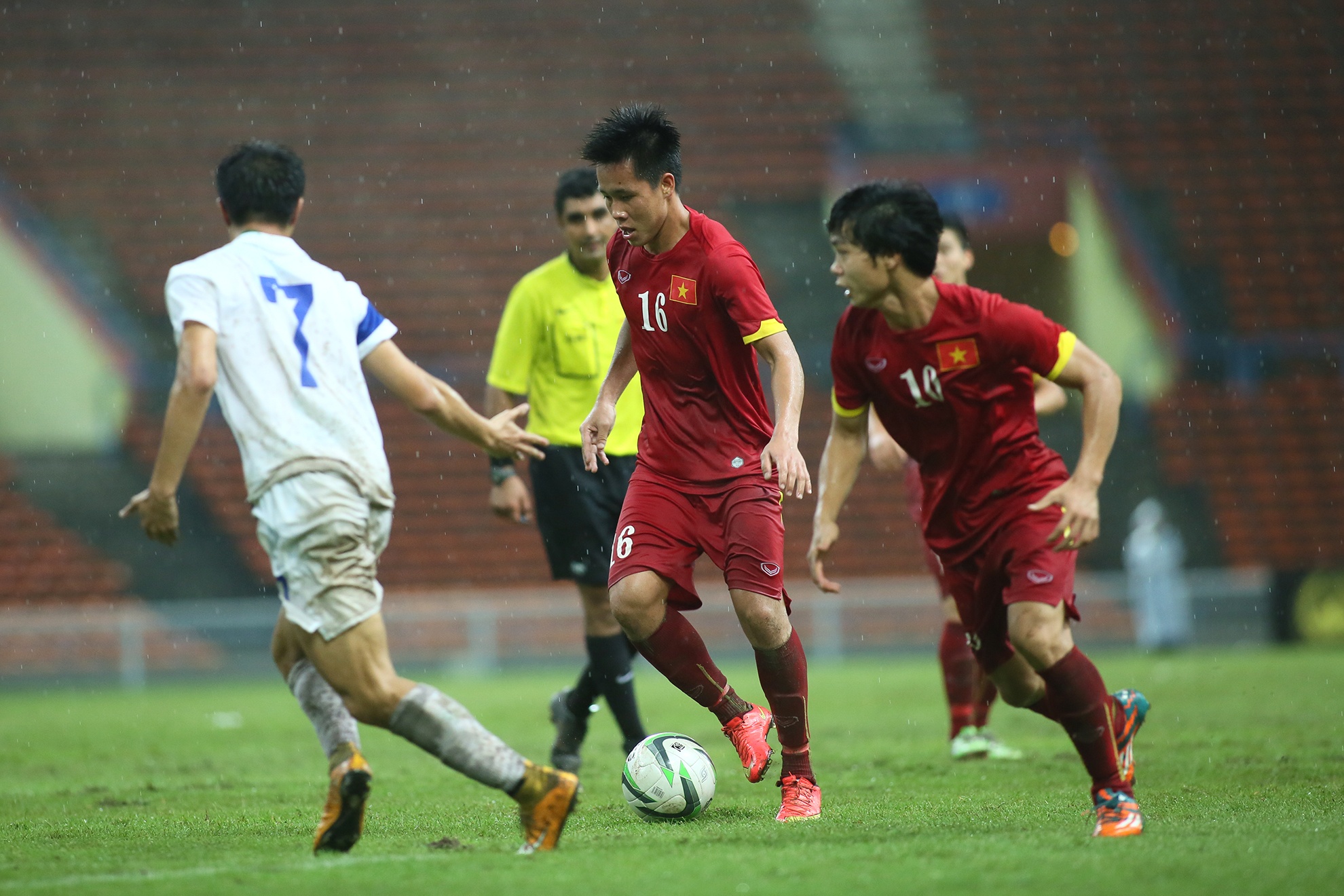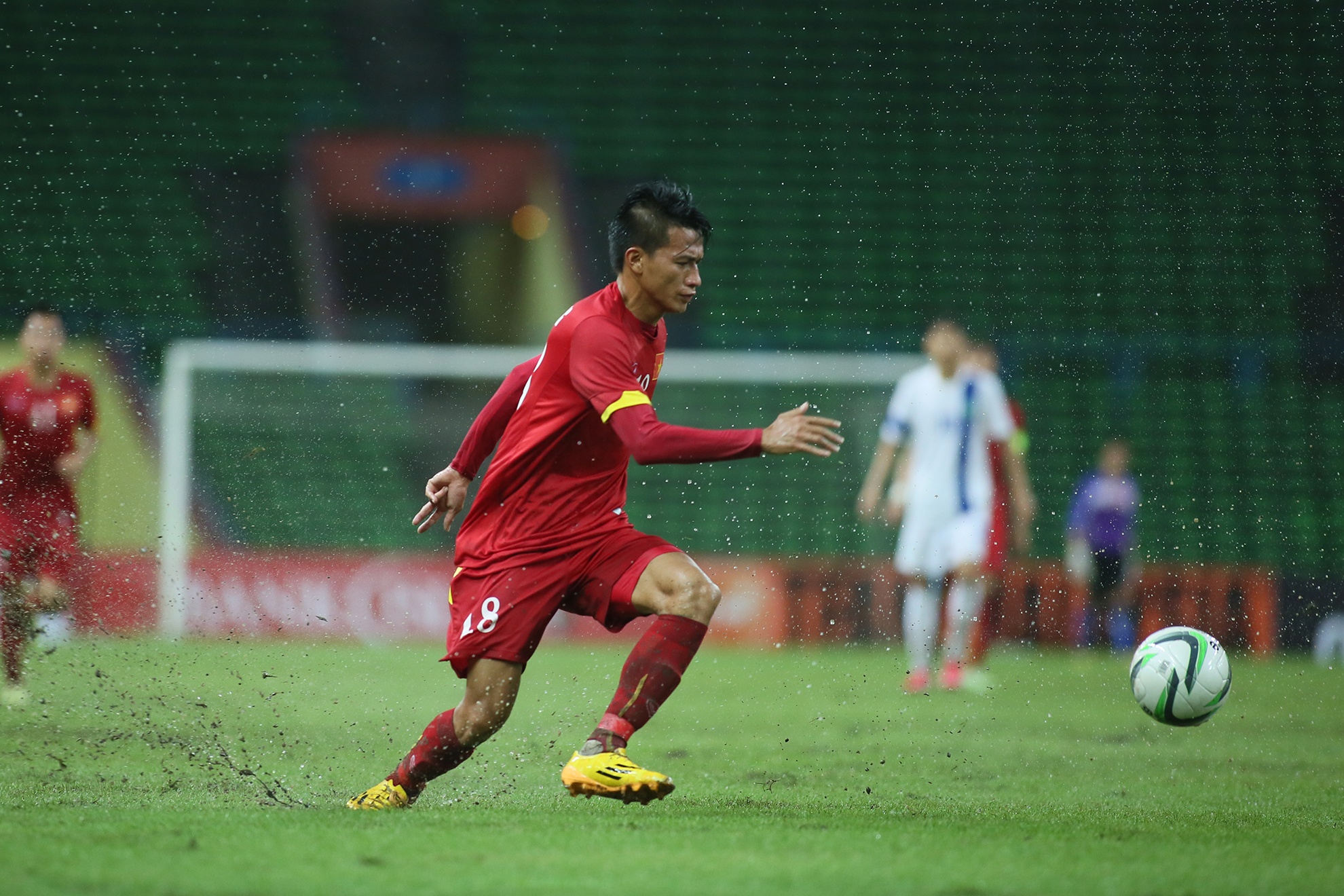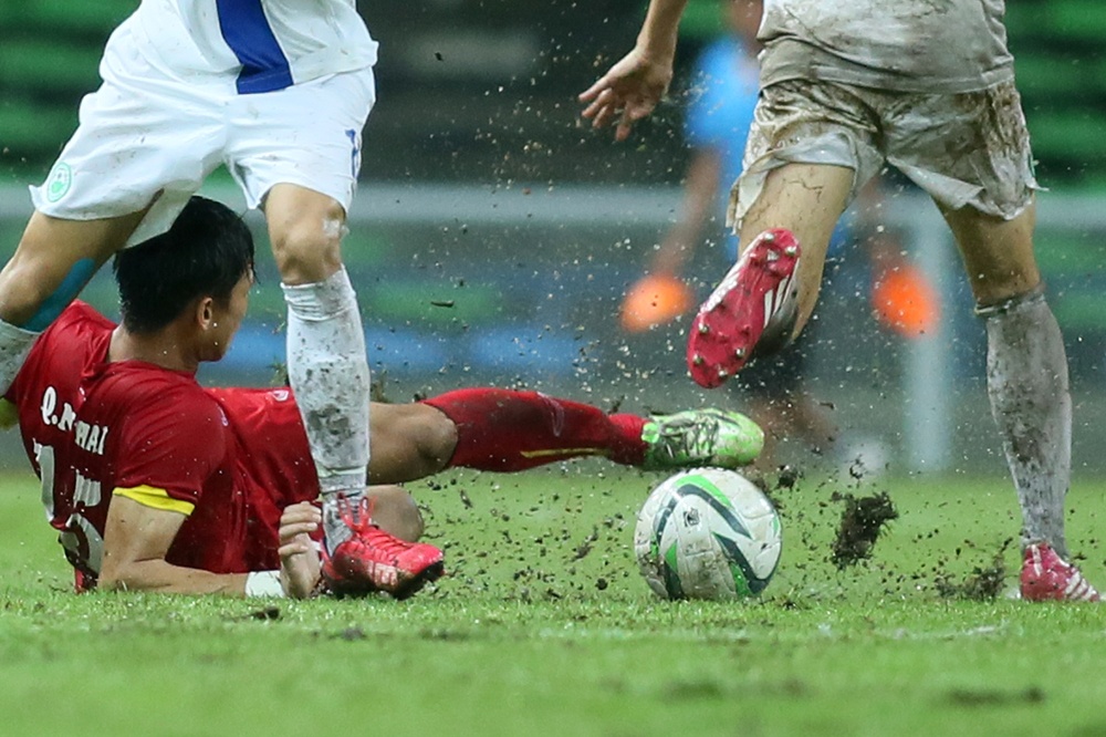 | Mưa ướt gây ảnh hưởng khá nhiều đến các pha dứt điểm của cầu thủ áo đỏ. Nhiều tình huống Công Phượng đi bóng qua cầu thủ đối phương nhưng lại mất bóng vì mặt sân đọng nước giữ bóng lại. |