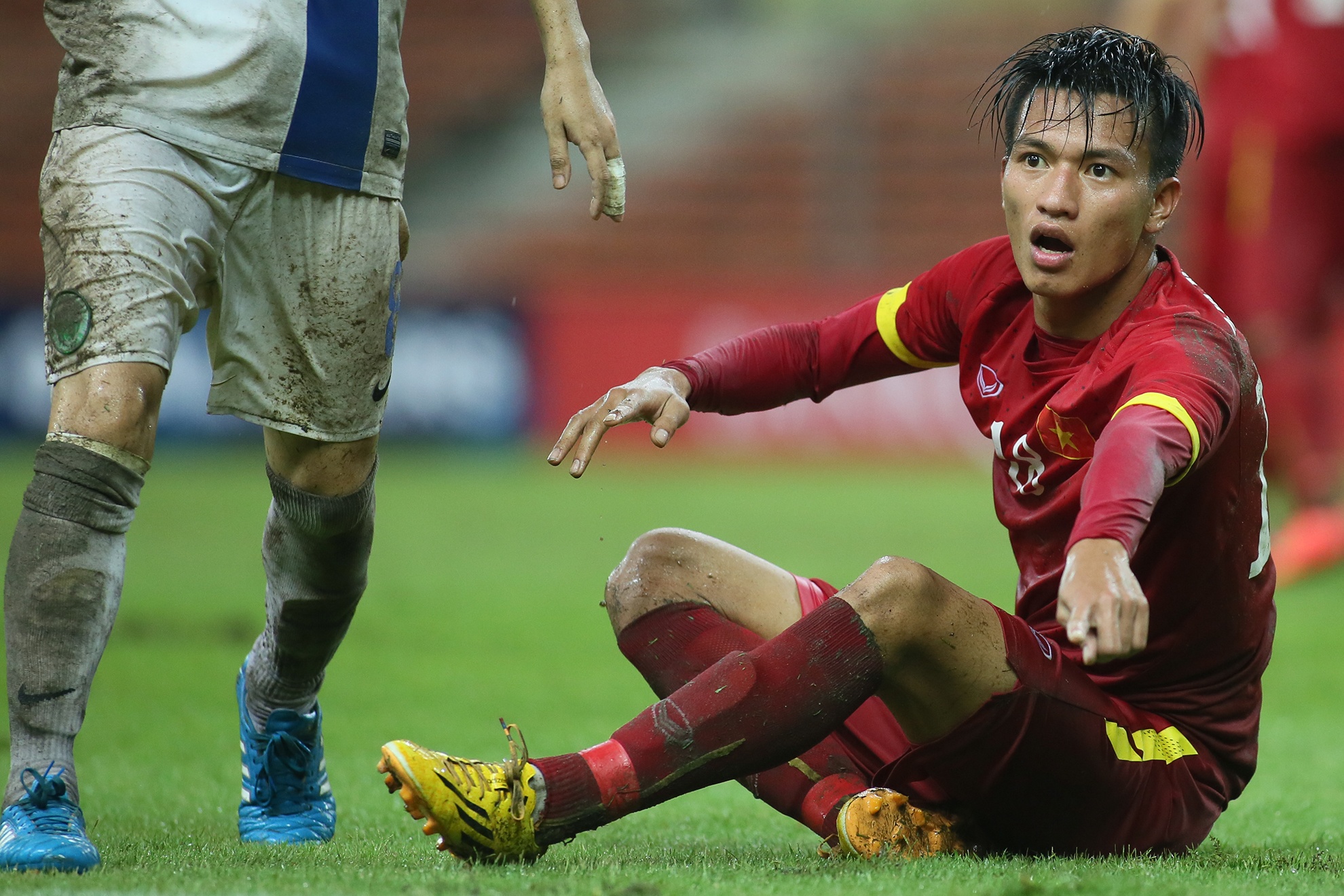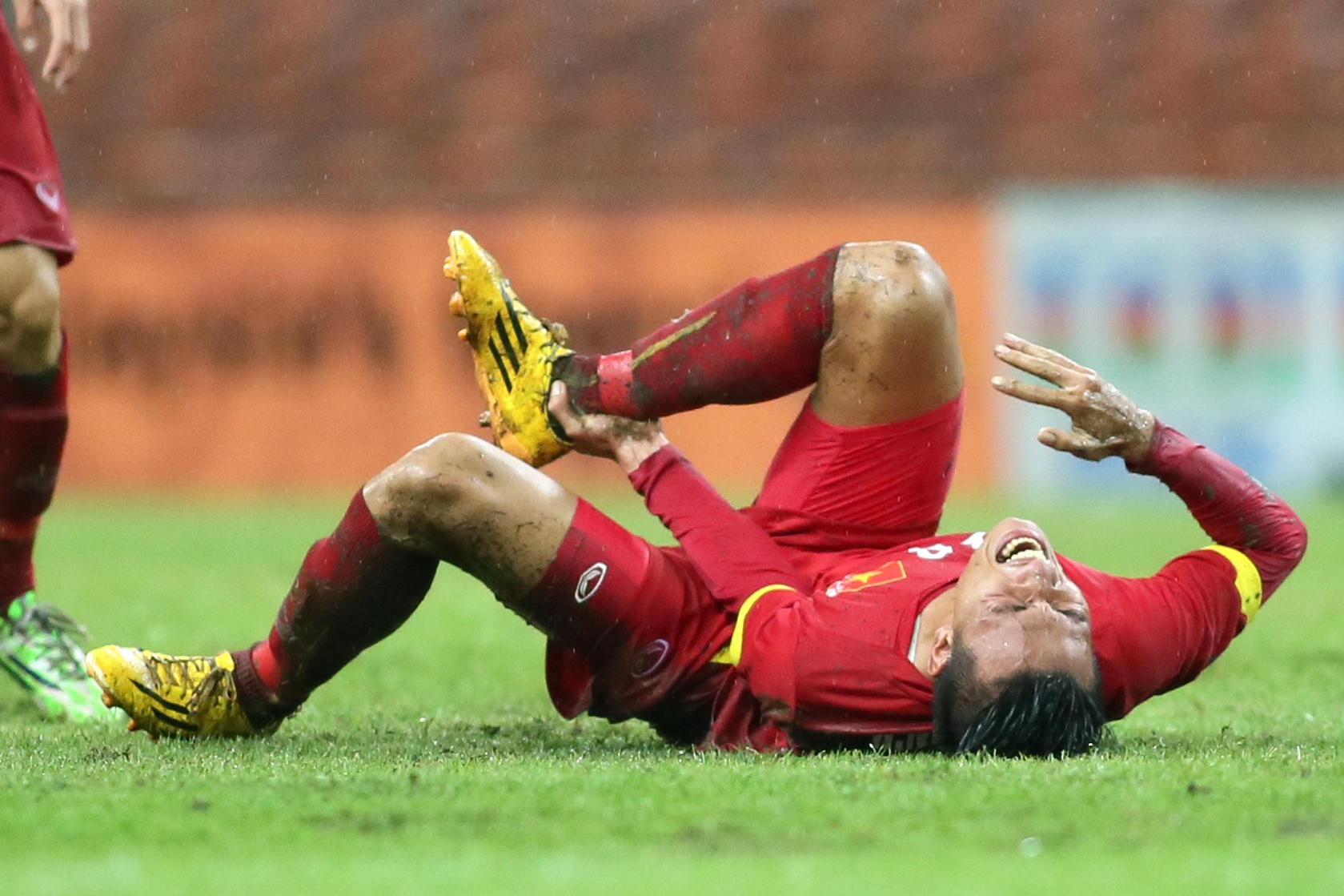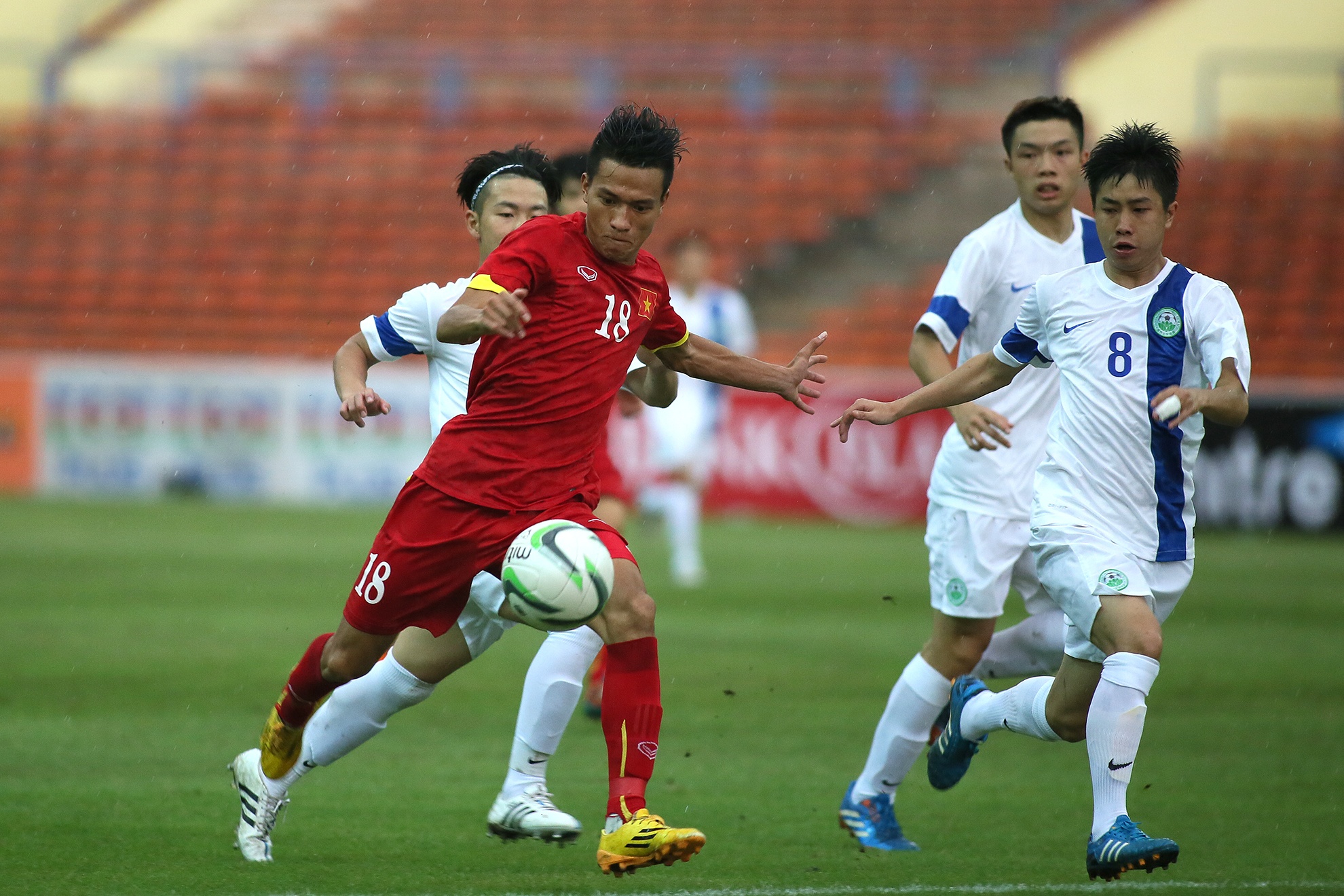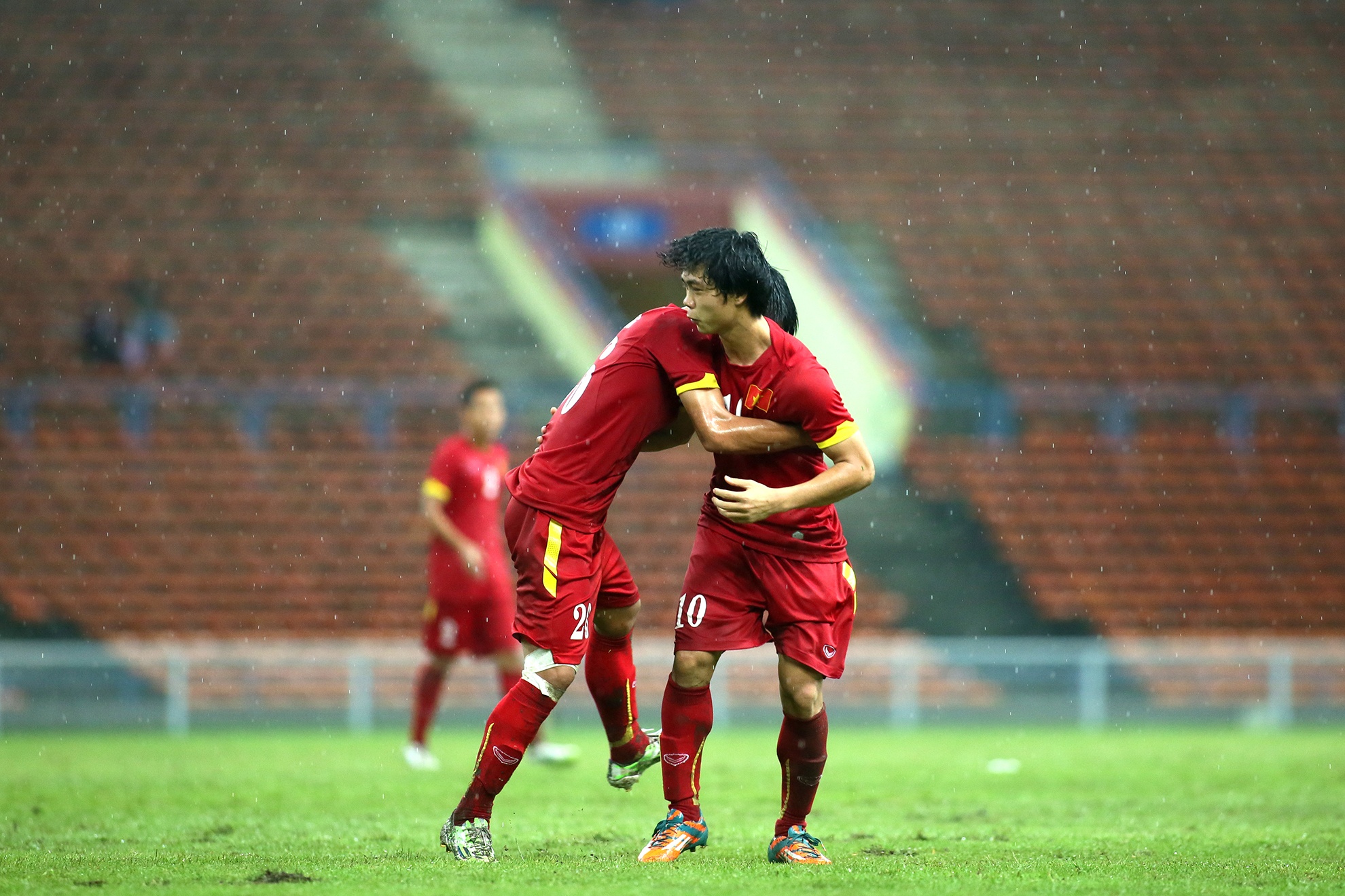 | Mưa ướt gây ảnh hưởng khá nhiều đến các pha dứt điểm của cầu thủ áo đỏ. Nhiều tình huống Công Phượng đi bóng qua cầu thủ đối phương nhưng lại mất bóng vì mặt sân đọng nước giữ bóng lại. |