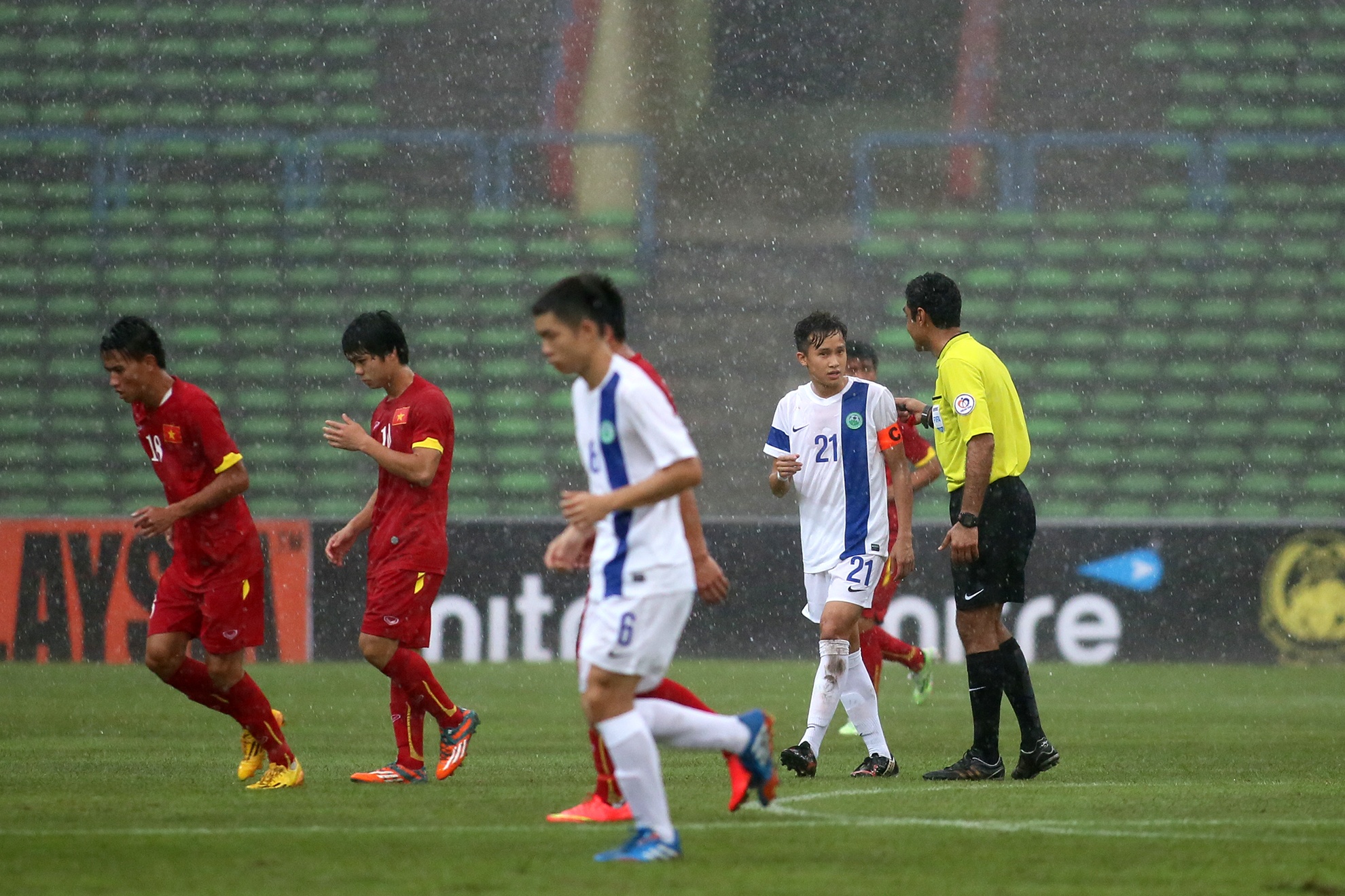 Sau khoảng 90 phút tạm hoãn, hai đội tiếp tục nhập cuộc. Lúc này mặt cỏ trên sân Shah Alam ngập nước gây không ít khó khăn cho các cầu thủ.