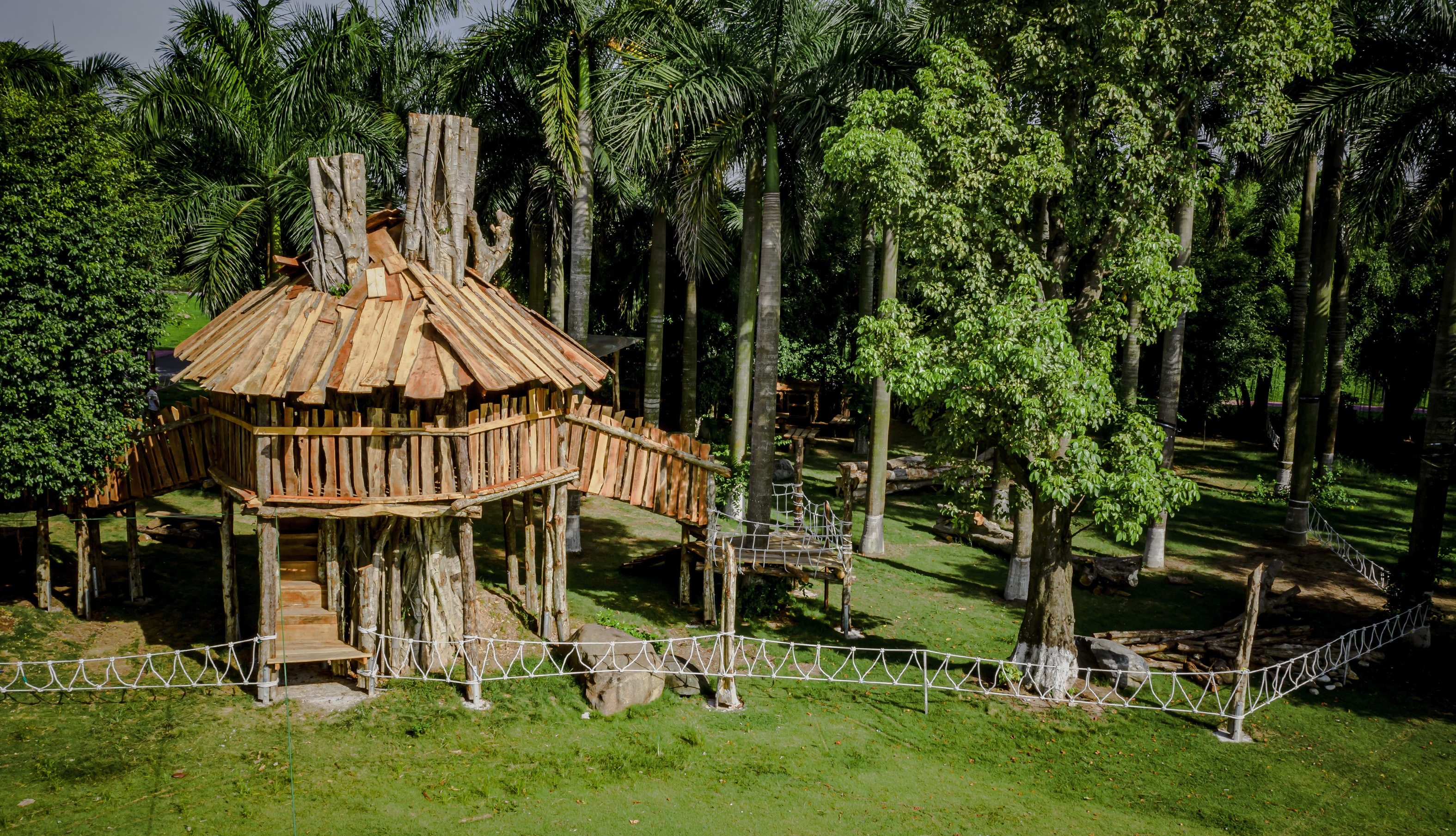 Toàn bộ khu vui chơi đươc làm từ gỗ tự nhiên, vừa tạo cảm giác gần gũi vừa kích thích sự tò mò của trẻ. Các trò chơi tại đây mang tính gợi mở, khuyến khích hoạt động leo trèo, thăng bằng, tăng khả năng nhận diện không gian hình học… “liều” thiên nhiên hoàn hảo để làm nên một em bé hạnh phúc, khỏe mạnh và thông minh.