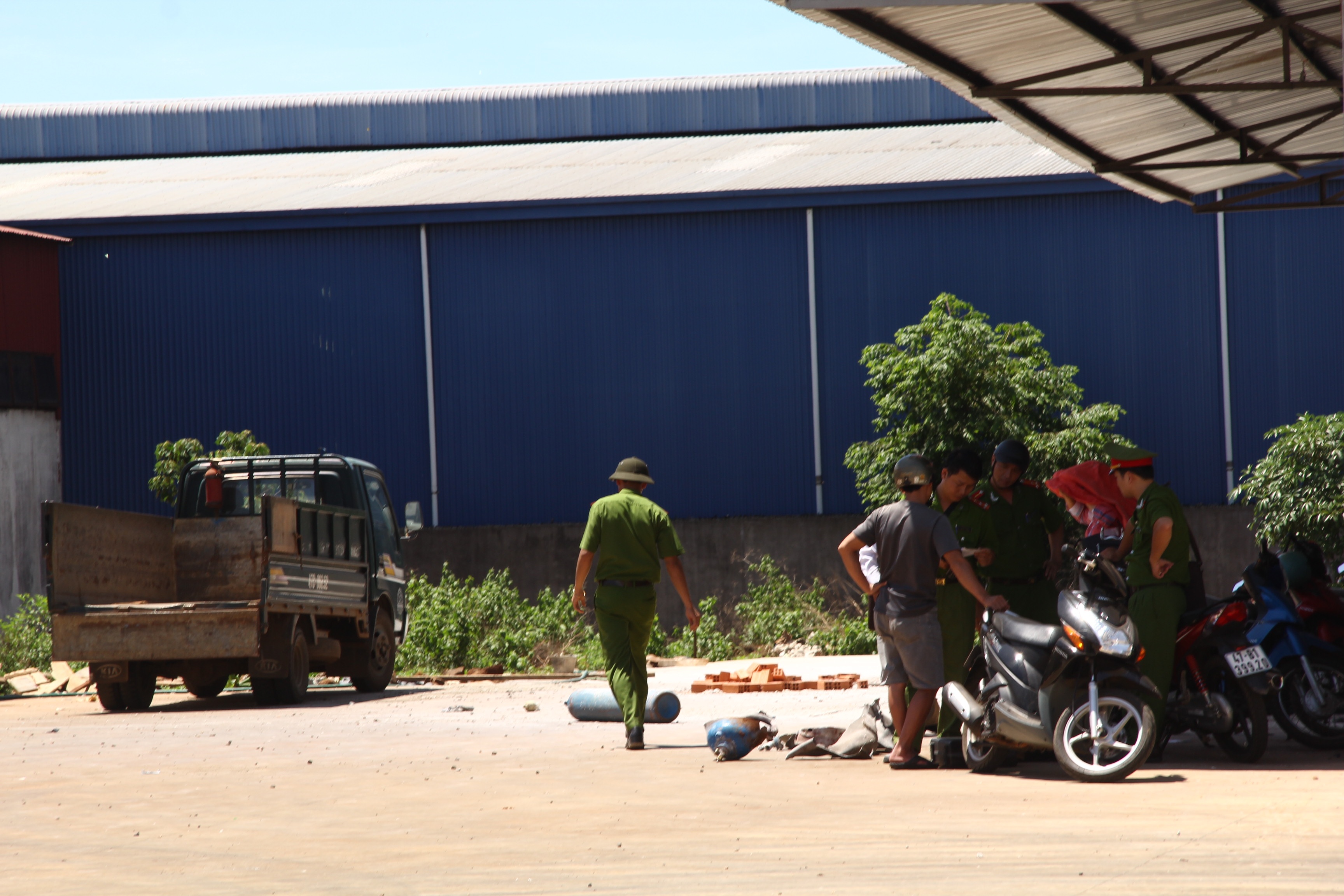 Tại khu nhà xưởng, có 2 thi thể nạn nhân không toàn thây, vương vãi khắp nơi, 1 người nằm bất động trên sân. Các bình để sang chiết khí gas, oxy… nằm lăn lóc trong nhà xưởng, ngoài sân.