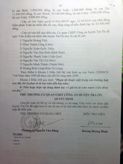 Trong bản kết luận điều tra mới đây của cơ quan CSĐT huyện Trà Ôn cho biết: ''Tài liệu điều tra chứng minh Hoàng Kim Long (tức NSƯT Kim Tử Long – PV) tham gia đặt tài xỉu nhiều ván. Ván thấp nhất là 200 ngàn, ván cao nhất là một triệu đồng. Tham gia đến khi công an bắt quả tang''.
