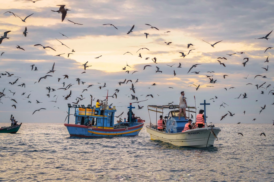 Thuyền chở ngư dân và du khách xem cá voi săn mồi trên biển Nhơn Lý, tháng 7/2025. Ảnh: Nguyễn Ngọc Thiện. |