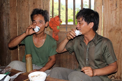 Mời chúng tôi ngồi xuống, bố A Tiêm nói rằng, hôm nay có cán bộ nên phải vui, mà vui thì phải say mới quý. Hai cô gái ngồi bên cạnh, một là em gái Tiêm, một cô hàng xóm, tay bế cho con ngủ, tay với bát rượu uống ừng ực.