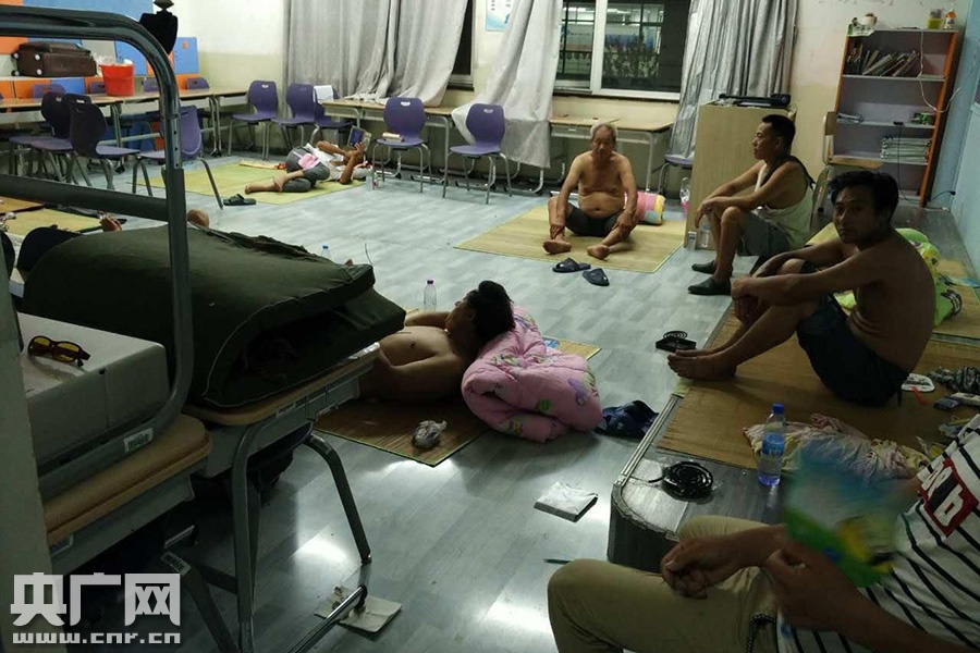 | Người dân ngủ trong lớp học. Do diện tích trường có hạn, nhiều người phải mang theo chăn, màn và đồ dùng thiết yếu để ngủ ngoài đường. |