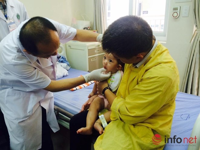 Vợ chồng chị đưa con đi kiểm tra, bác sĩ cho biết cháu bị hở vòm miệng. Đến nay, sau 2 cuộc mổ cháu vẫn chưa lấp được lỗ thủng ở vòm miệng. Mỗi lần ăn, nếu không cẩn thận là cháu lại bị thức ăn lên mũi. Nhìn con ăn uống khổ sở, có lúc bố mẹ chỉ biết ôm con khóc.