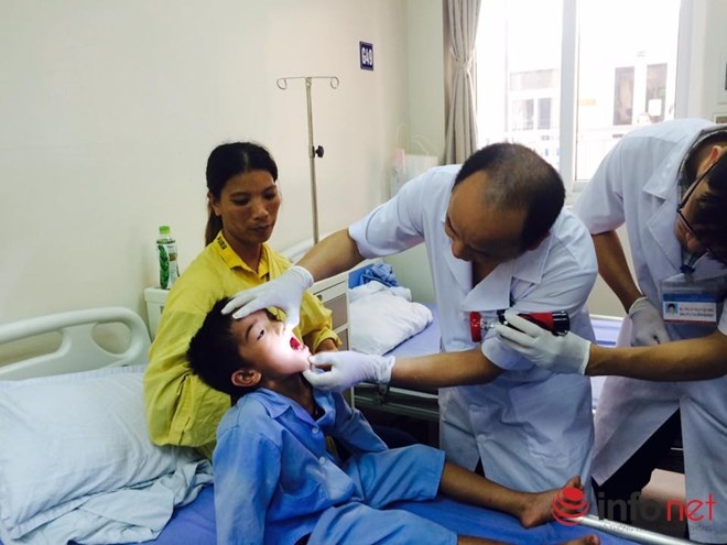 Chị đã đưa con đi phẫu thuật vài lần nhưng lỗ hổng trong vòm vẫn lớn nên phải mổ thêm vài lần để điều trị. Bác sĩ chuyên khoa II, Nguyễn Mạnh Hà – trưởng khoa Phẫu thuật tạo hình hàm mặt, Bệnh viện Răng Hàm Mặt trung ương cho biết bé Quân bị hở vòng họng rộng nên đợt phẫu thuật này các bác sĩ sẽ lấy một phần ở tổ chức lưỡi để lấp vào lỗ hổng. Sau này, cháu sẽ phải làm phẫu thuật ghép xương để đóng hàm giúp mặt phát triển tự nhiên, không bị thiểu năng hàm trên.