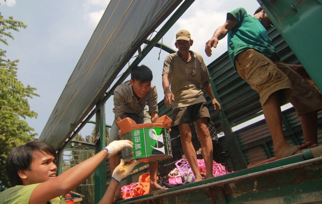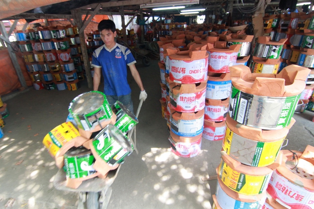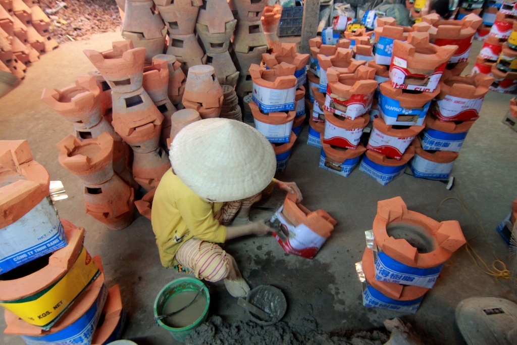 | Bếp lò phải trải qua nhiều công đoạn để thành một sản phẩm hoàn chỉnh. Mỗi đợt, có hàng ngàn "ông Táo" lớn nhỏ của ông Năm Tiếp được xếp lên xe chở đi khắp nơi. |