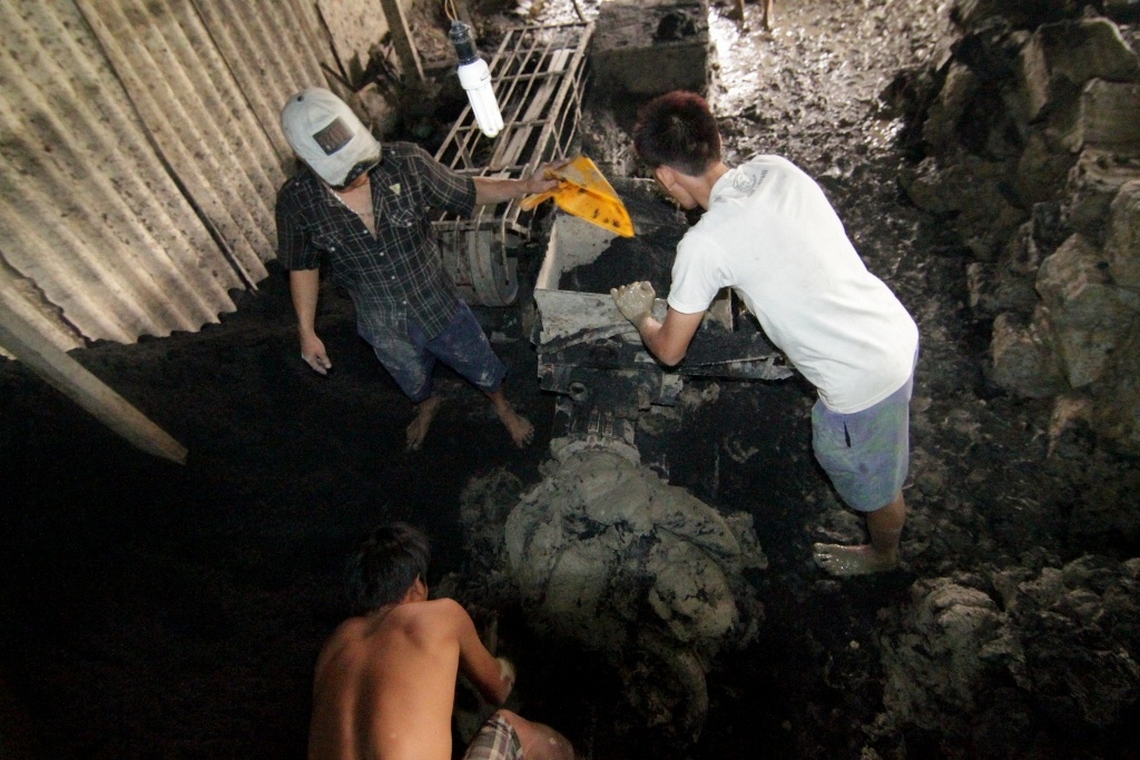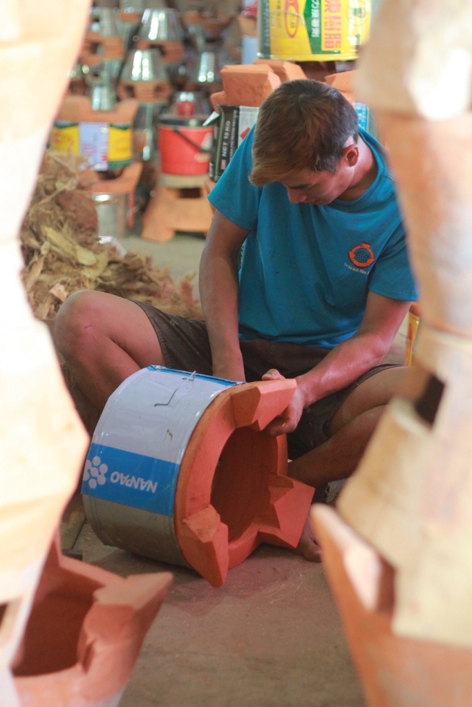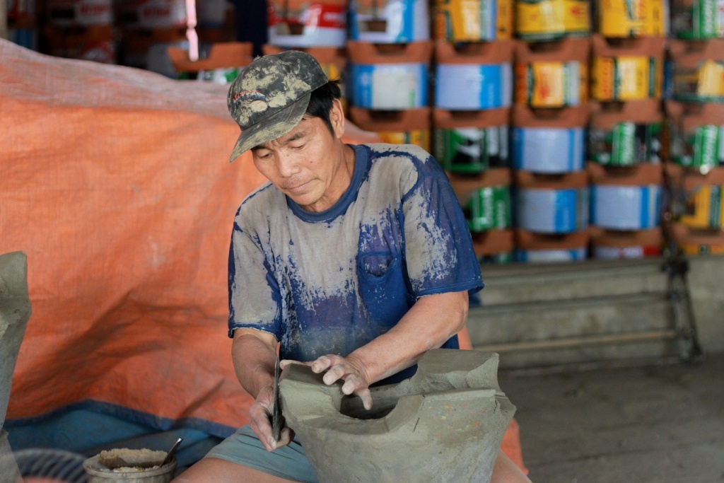 | Công việc cắt tỉa đòi hỏi thợ phải tỉ mỉ. Trong ảnh: Ông Phan Văn Tâm đang dùng dao gọt, cắt những phần đất thừa để bếp lò hài hòa hơn. Ông Tâm theo nghề này gần 30 năm, khi nhiều cơ sở khác đóng cửa thì ông về làm ở xưởng Năm Tiếp. Đây là xưởng làm bếp lò bằng đất duy nhất còn sót lại của Sài Gòn. |