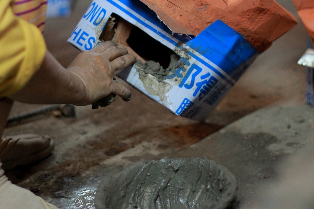 | Nguyên liệu gia cố là xi măng, xơ dừa được nhét vào miệng bếp. |