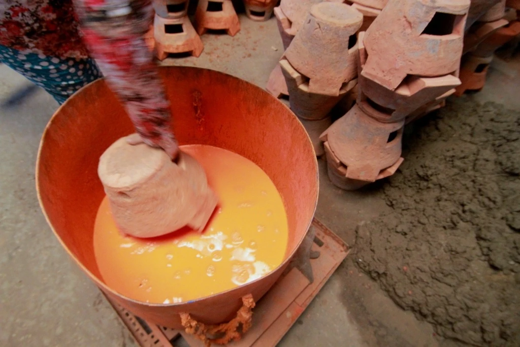 | Sau khi nung xong, có một số loại bếp cần được nhúng qua nước màu để có màu sắc ấn tượng. |