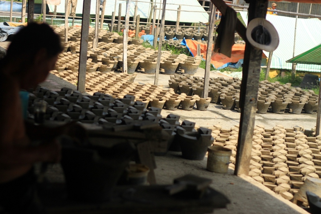 | Thợ dùng bàn xoay tạo hình lò, còn 3 chân thì dùng tay để nặn. Công việc này đòi hỏi thợ phải có tay nghề cao để đảm bảo độ cân xứng. |