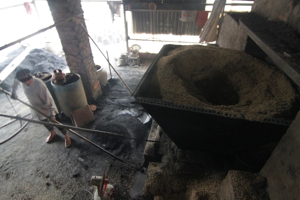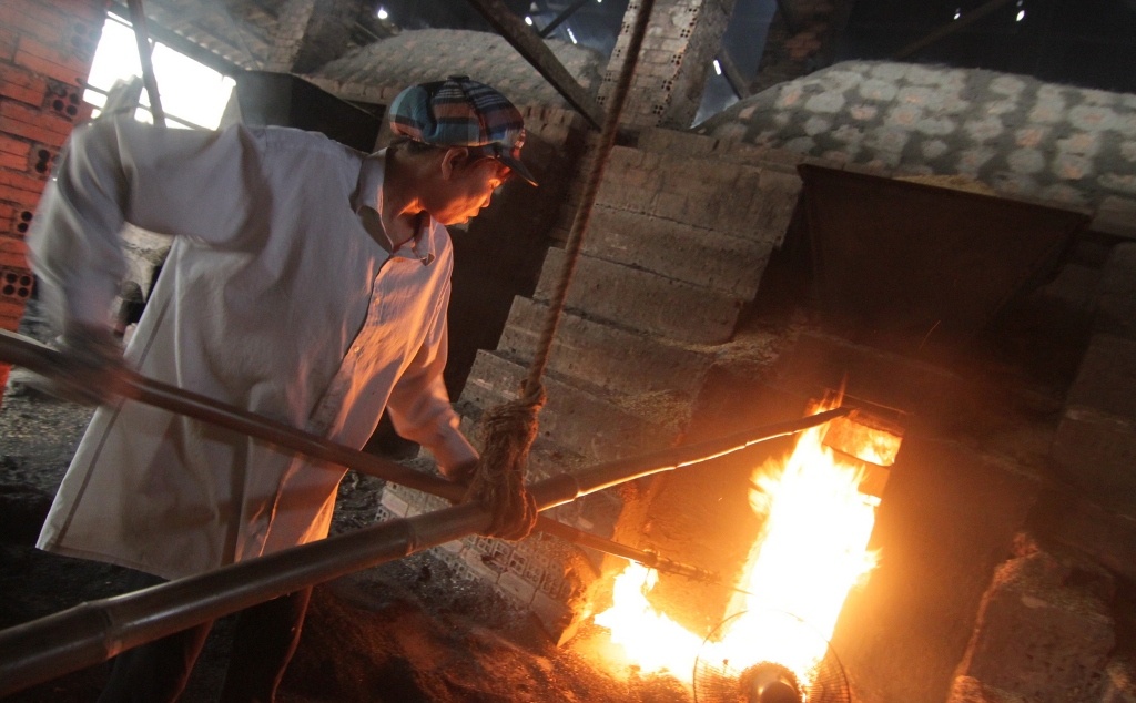 | Thợ phải túc trực bên lò nung để trở lửa, thêm trấu. |