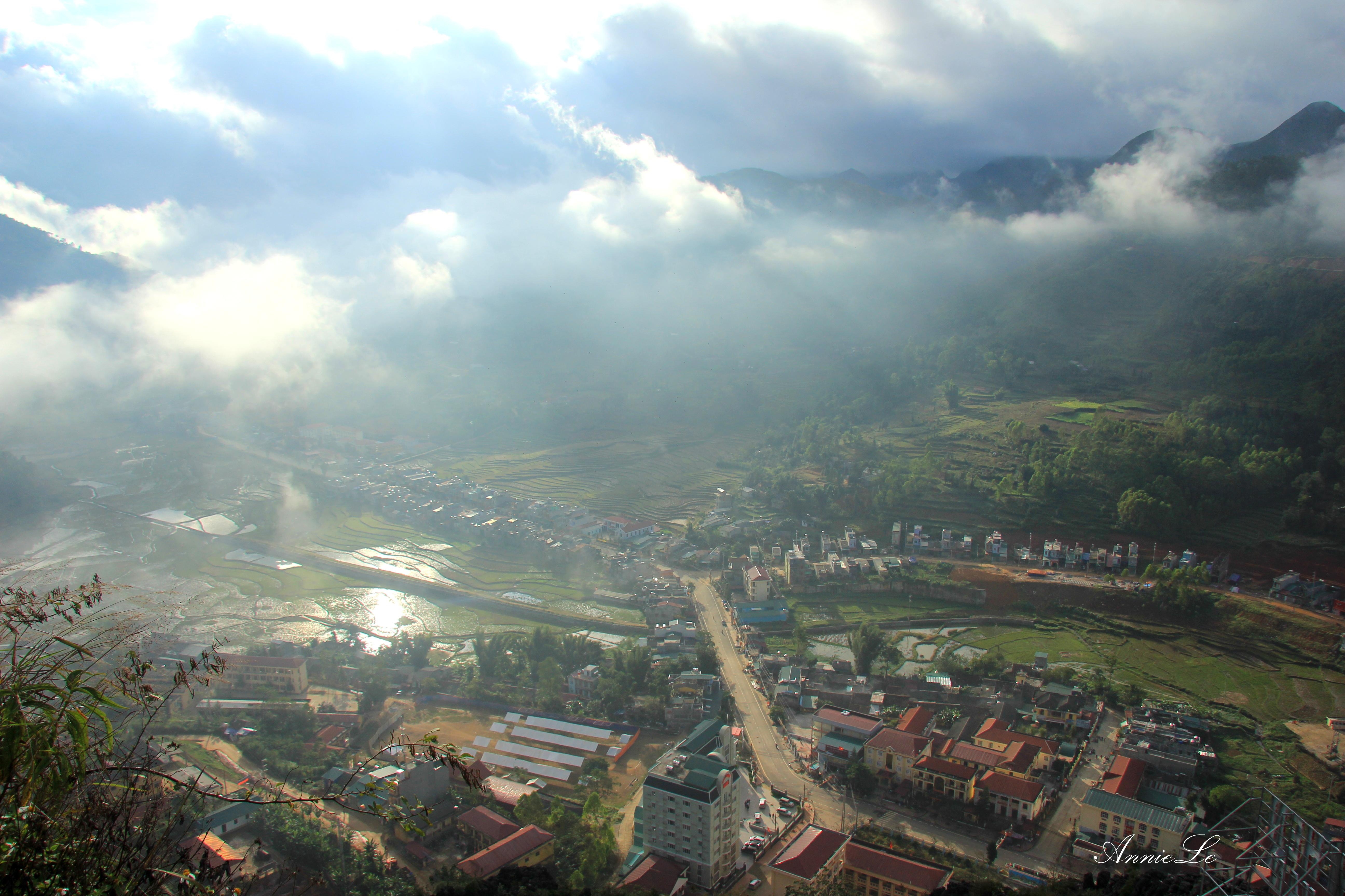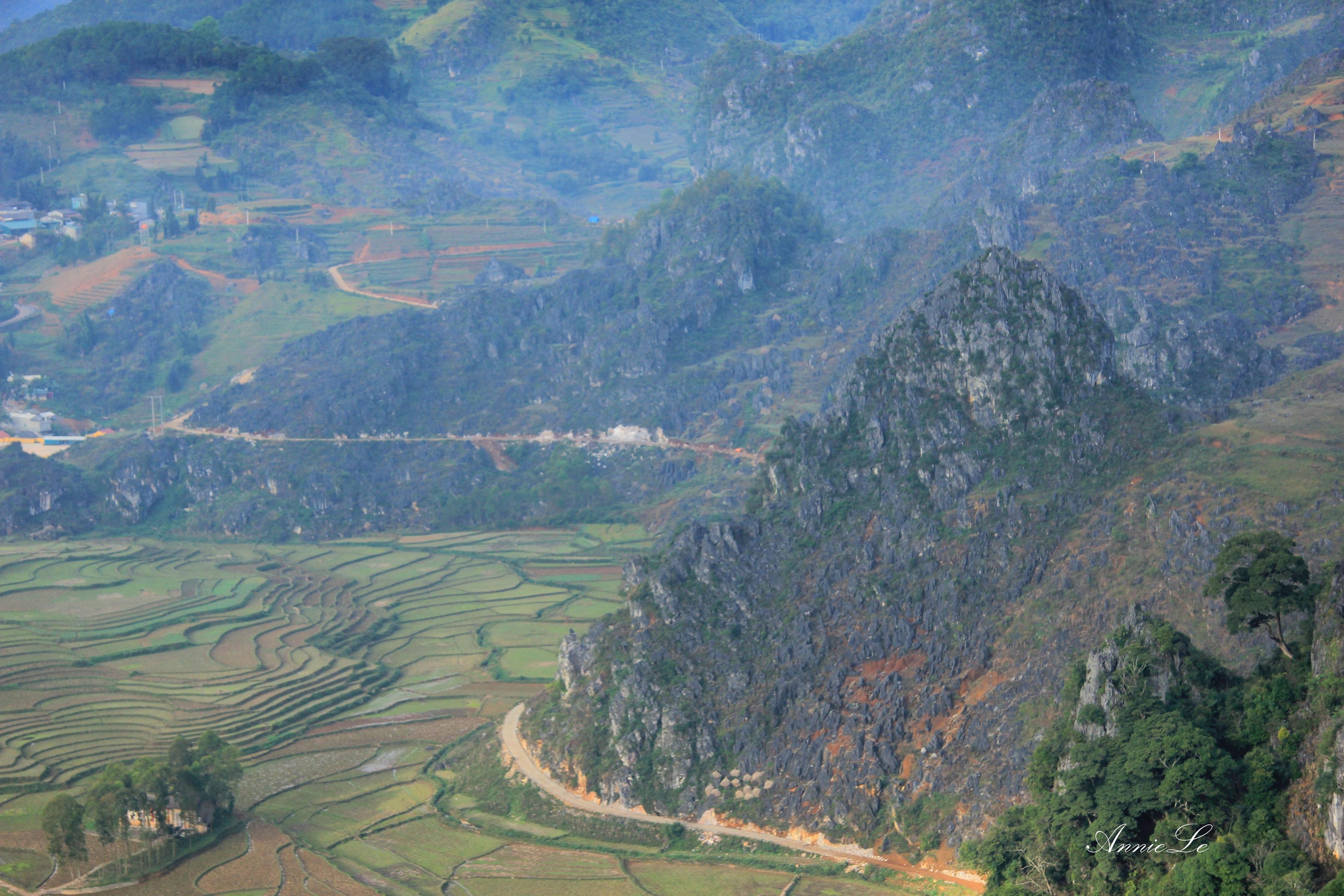 | Dưới chân là thung lũng Đồng Văn mờ ảo trong nắng sớm. |