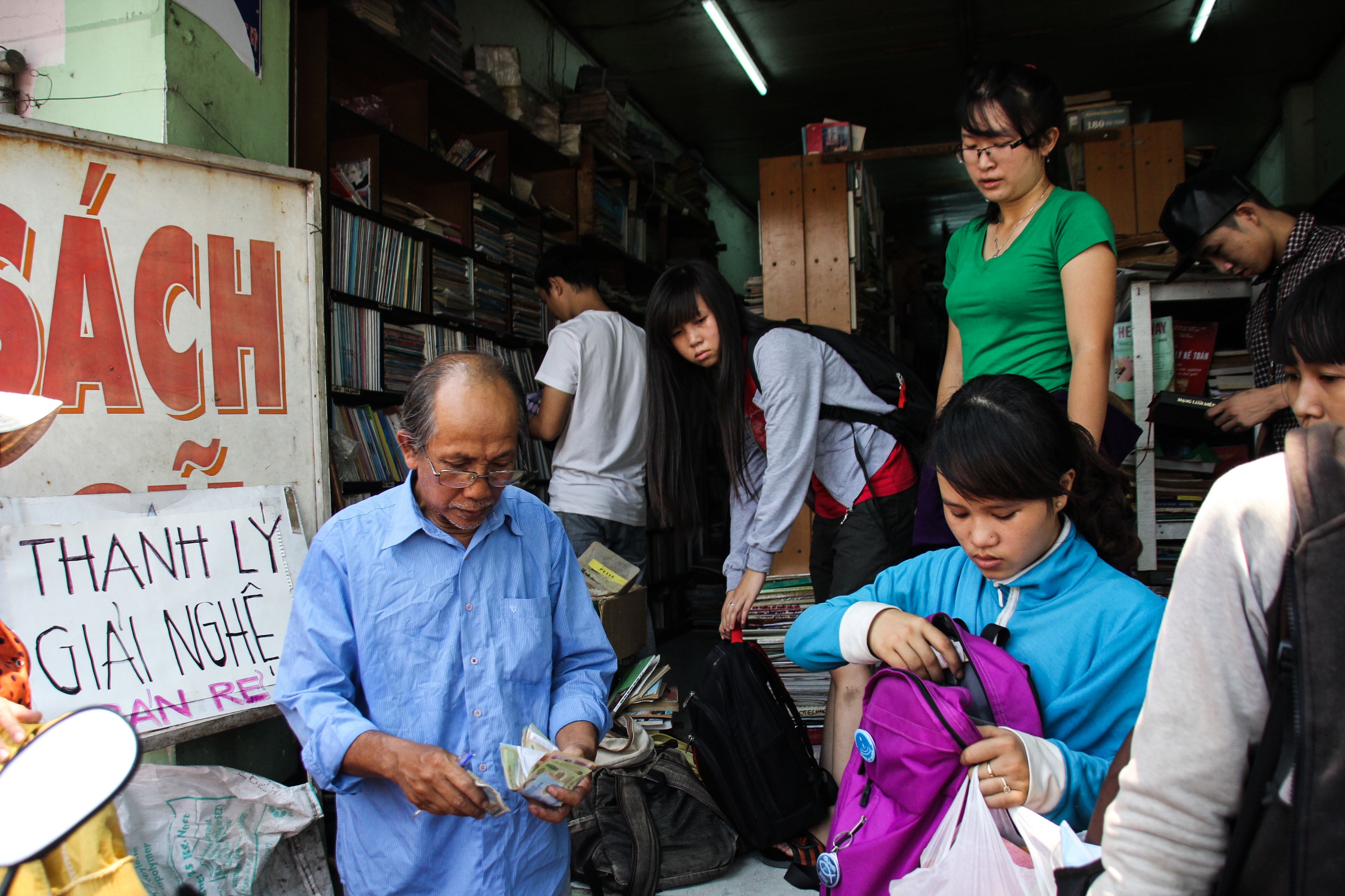 | Từ ngày treo bảng "giải nghệ", ông luôn tất bật tiếp khách, tính tiền mua sách. Trước nghĩa cử đẹp đẽ của các bạn trẻ, ông Trí cho biết rất cảm động. "Tôi vui vì được các em giúp đỡ và hạnh phúc khi thấy bạn trẻ vẫn rất mê sách, văn hóa đọc vẫn hiện diện nơi các bạn". Ông kể có nhiều bạn không chỉ mua mà còn ủng hộ ông bằng cả hiện kim. |