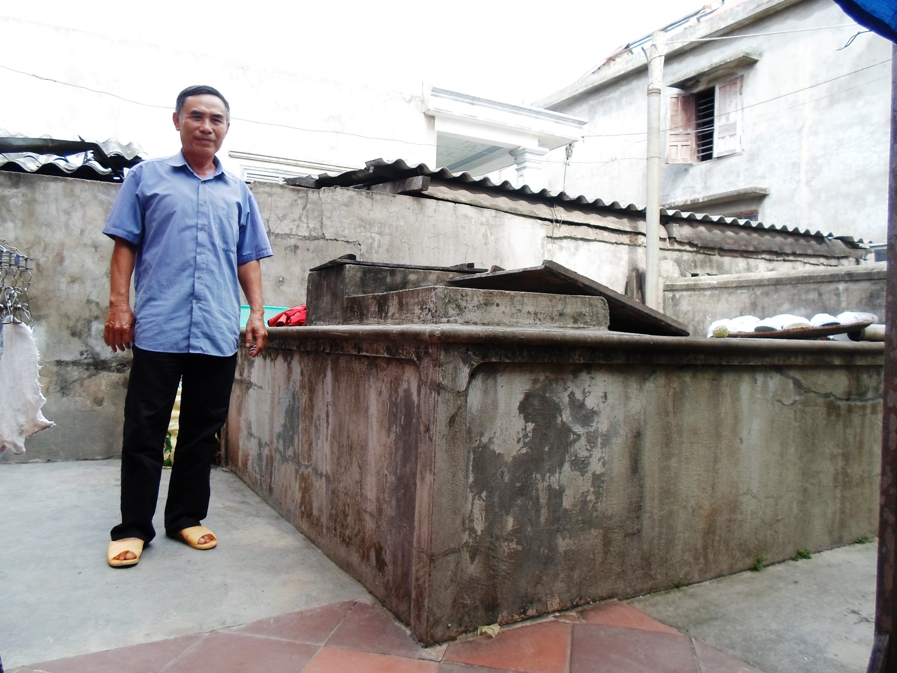 | Trưởng thôn Văn Phú- Hoàng Văn Huề bên một bể cạn có thể chứa đến 10 khối nước để hứng nước mưa và đựng nước mua về. |