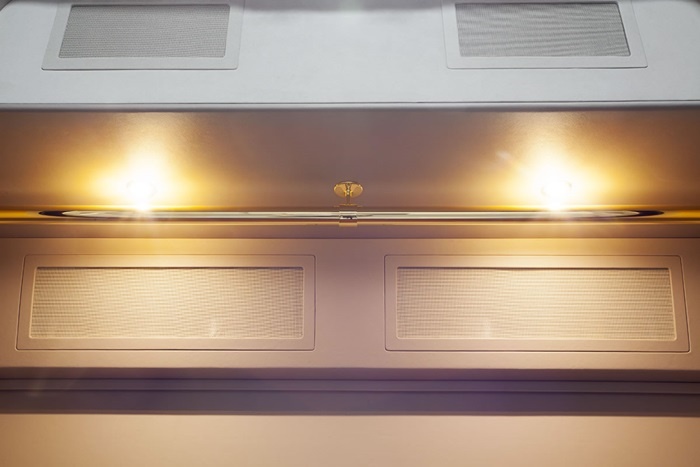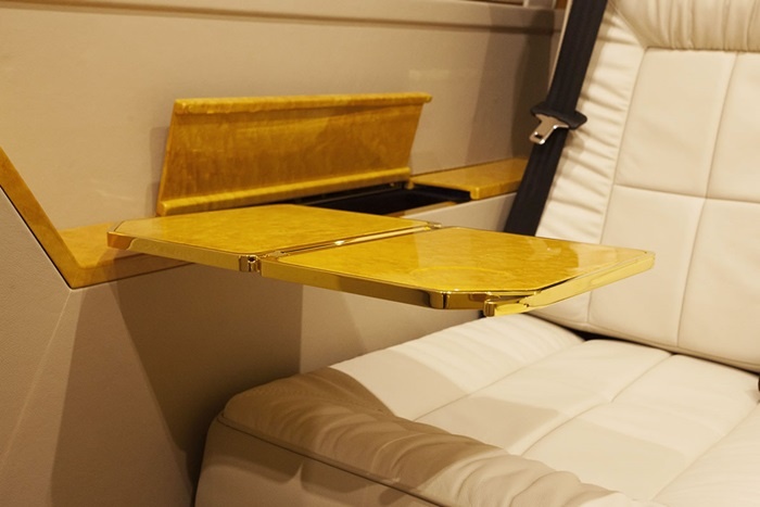 | Trần xe cũng được dát vàng. Trên xe còn có máy pha cafe, tủ rượu. |