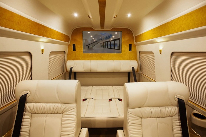 Chiếc xe 16 chỗ được thiết kế lại với phong cách sang trọng, ghế bọc da xịn, không gian dát vàng và nhiều tiện ích công nghệ.