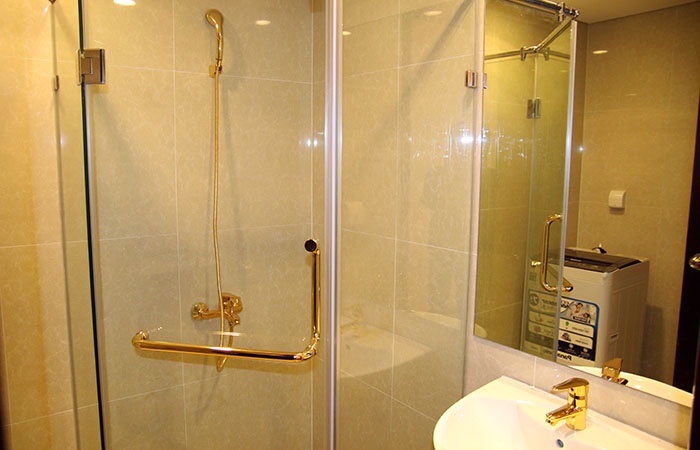 Anh Nguyễn Ngọc, kỹ sư thực hiện công trình này chia sẻ: "Đây là căn hộ có nhiều nhất các chi tiết mạ vàng mà anh từng thực hiện. Toàn bộ chi tiết của các phòng tắm như vòi hoa sen, nút gạt bồn cầu, khay đựng giấy, vòi nước cho đến tay nắm cửa cũng được tháo ra để phủ vàng". |