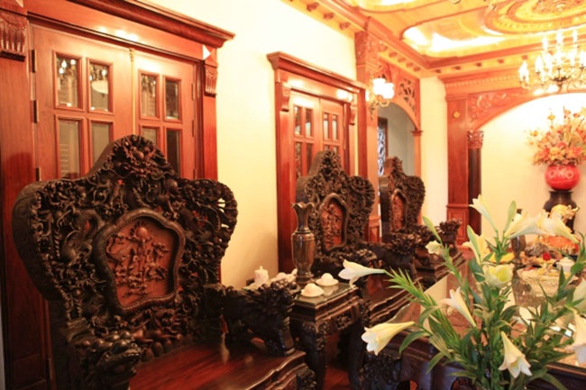 | Bộ ghế tại phòng khách chạm trổ công phu. |