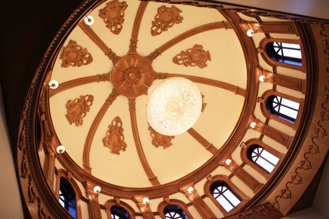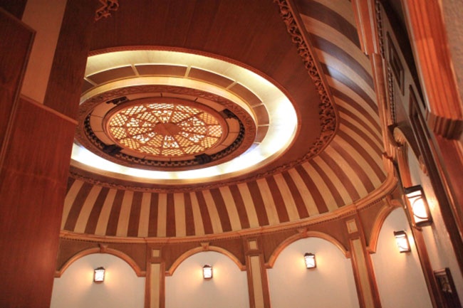 | Mái trần hình bán nguyệt vốn có quá nhiều chi tiết được chiếu sáng bằng những chiếc đèn hắt sáng đơn giản, thay vì đèn chùm, giúp nổi bật màu gỗ tối và không gây rối mắt. |
