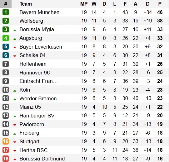 | Bảng xếp hạng Bundesliga sau 19 vòng đấu. |