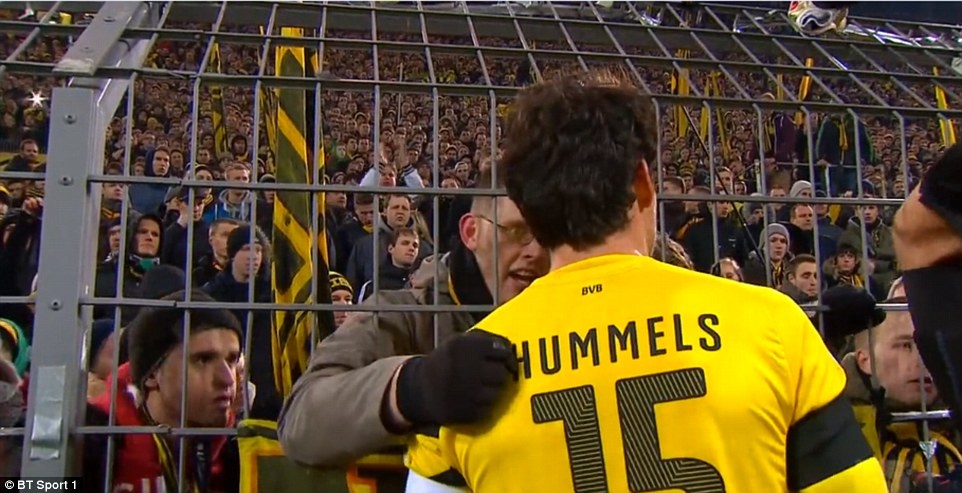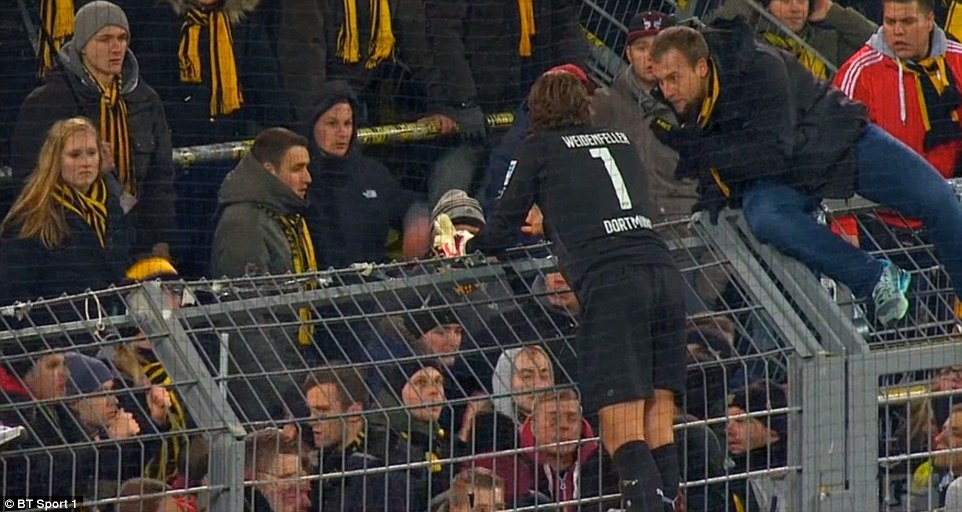 | Thủ môn số 1 của Dortmund trèo hẳn lên hàng rào chắn để giải thích cho những fan quá khích. |