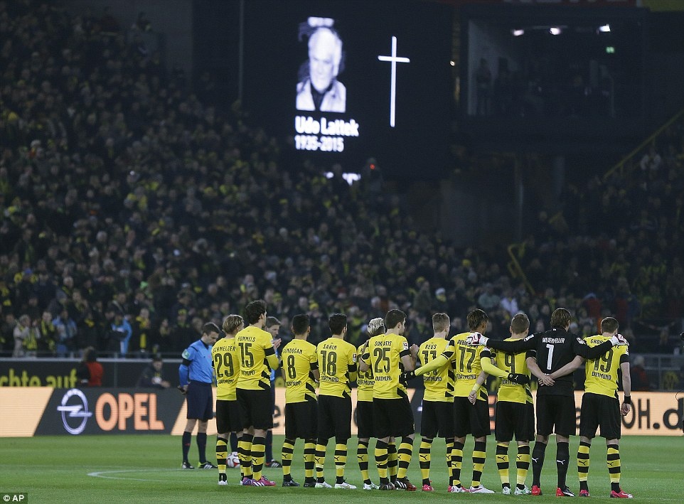 | Cầu thủ hai đội dành một phút tưởng niệm cố HLV Udo Lattek của Dortmund, người vừa qua đời hôm thứ 7 vừa qua ở tuổi 80. |