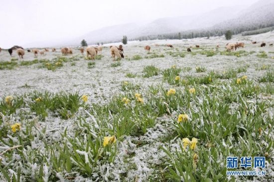 Thời tiết mát mẻ kèm tuyết rơi trên những cánh đồng cỏ Hami ở phía đông bắc khu tự trị Tân Cương hôm 31/5.