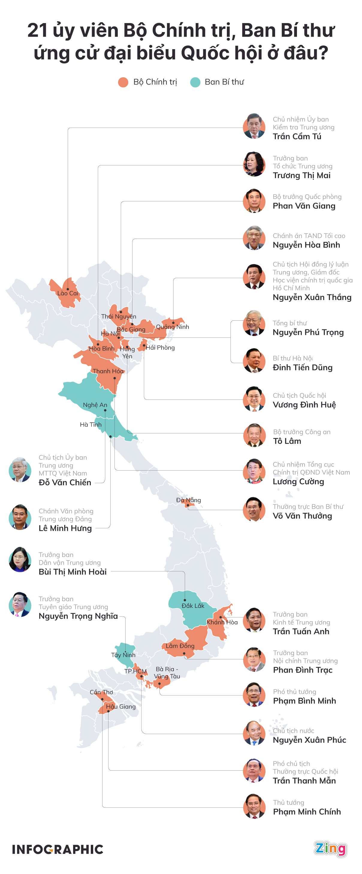 Nơi ứng cử đại biểu Quốc hội của 21 ủy viên Bộ Chính trị, Ban Bí thư