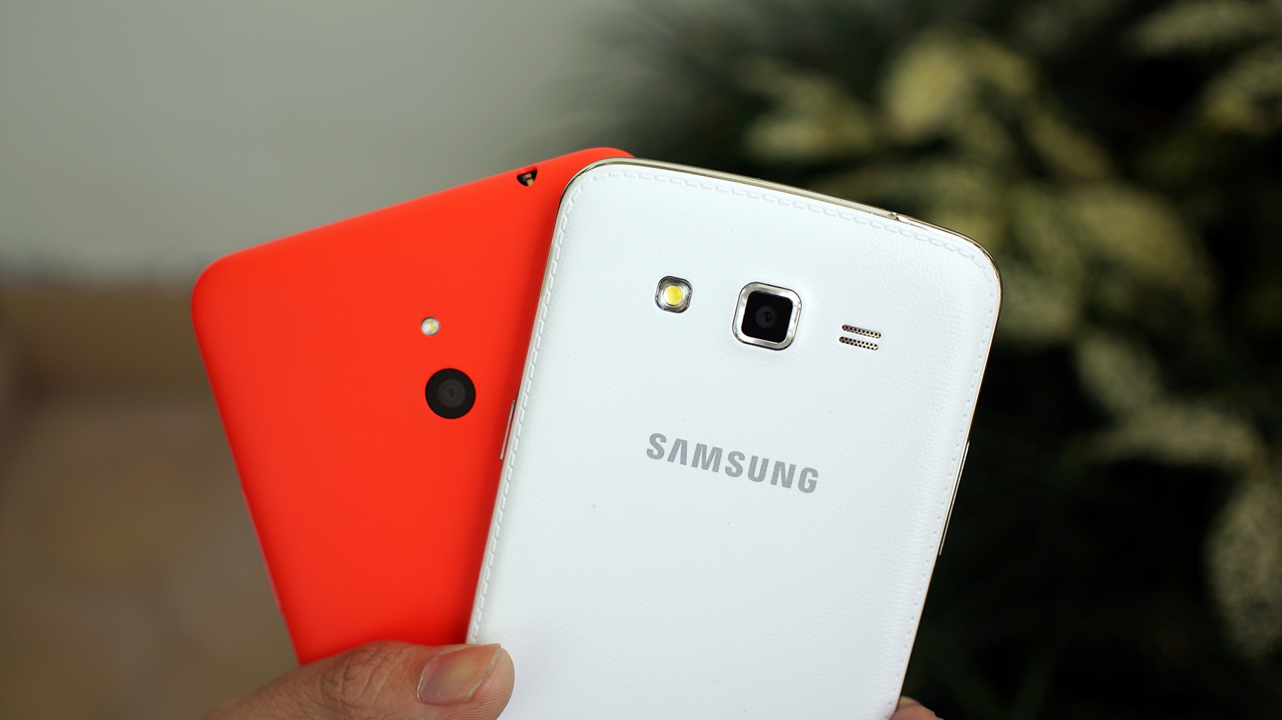 | Mặt sau của cả hai khá đơn giản. Lumia 1320 có vỏ lưng nhám mịn, Grand 2 lại có lớp nhựa vân da như Note 3. |