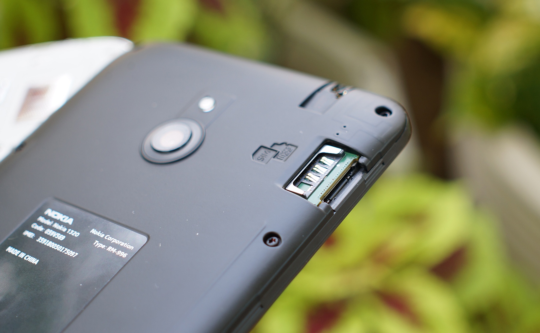 | Khe SIM và thẻ nhớ của Lumia 1320 được chồng lên nhau nhằm tiết kiệm diện tích. |