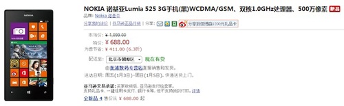 Tại thị trường Trung Quốc, Nokia Lumia 525 đang có giá cực thấp ở mức 165 USD (tương đương 3,4 triệu đồng) thấp hơn cả lúc Lumia 520 ra mắt với giá 214 USD (khoảng 4,5 triệu đồng) cách đây một năm. Tuy nhiên, chưa dừng lại ở đó vì chỉ ít ngày sau khi mức giá kia được niêm yết, Lumia 525 đã có giá bán mới thấp hơn khá nhiều, chỉ còn khoảng 103 USD (khoảng 2,1 triệu đồng), và trên trang bán hàng trực tuyến Amazon giá của thiết bị này chỉ còn khoảng 113 USD (khoảng 2,4 triệu đồng).