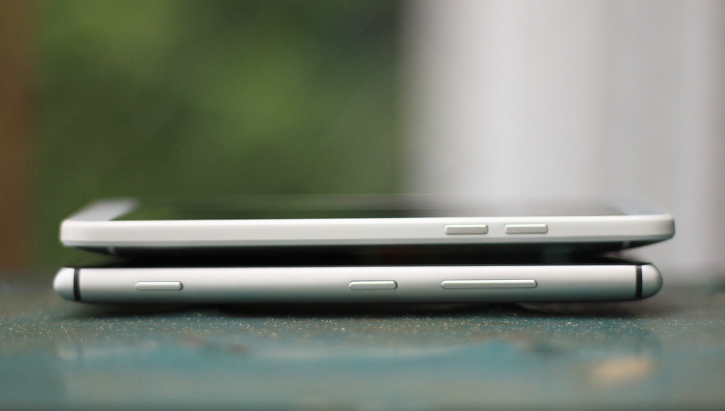 Nhìn từ cạnh phải, One Mini chỉ có nút tăng giảm âm lương được thiết kế riêng lẻ, trong khi phím bấm của Lumia 925 cũng có bề ngang tương đương, phím tăng giảm âm lượng kép. Cạnh phải điện thoại Nokia còn thêm phím nguồn và nút chụp hình. |