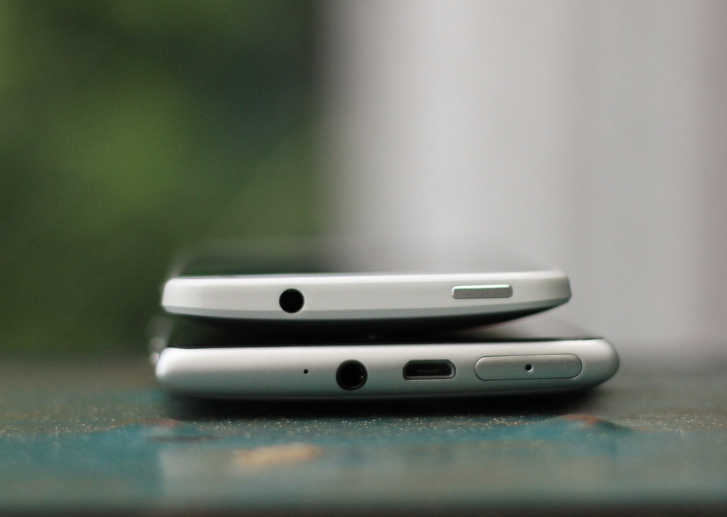 | Các kết nối còn lại, Nokia đưa lên trên đỉnh bao gồm khay SIM, microUSB, giắc cắm tai nghe, mic. Trong khi HTC lại bố trí nút nguồn và giắc cắm 3,5 mm. |