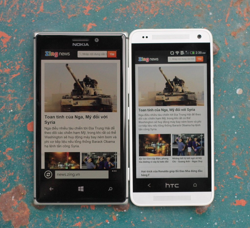Có mức giá gần nhau, Lumia 925 với thiết kế hơi lùn, màn hình có xu hướng màu ấm, trong khi One Mini thanh dài, màn hình sáng trắng.