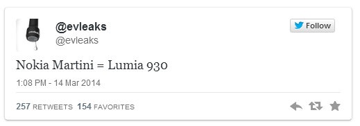 Theo tài khoản Twitter chuyên tung tin đồn @evleaks, Lumia 930 chính là thiết bị có tên mã Martini vừa mới rò rỉ đầu tháng 3. Lumia 930 chạy Windows Phone 8.1 có thể ra mắt vào tháng tới, trong một sự kiện riêng từ Nokia.