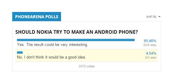 95,46% (3.219 trên tổng số 3.372) người được hỏi tin rằng Nokia nên cho ra mắt một chiếc smartphone Android. Chỉ có hơn 4% số người được hỏi nghĩ rằng đó không phải là một ý tưởng hay.