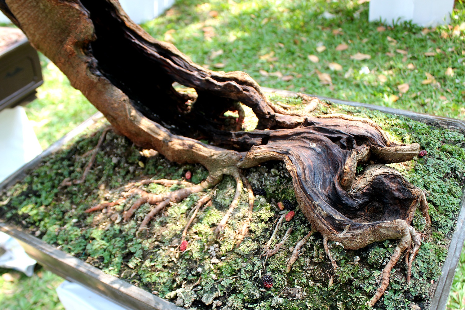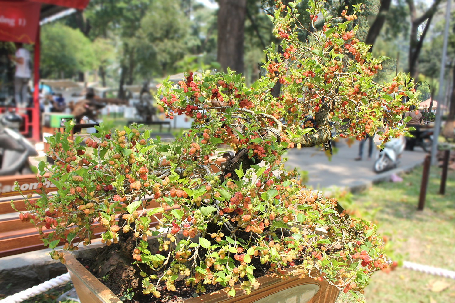 | Kiểng trái năm nay rất phong phú và đa dạng với nhiều loại độc lạ. Trong ảnh là cây dâu tằm tạo hình nghệ thuật chi chít quả . |