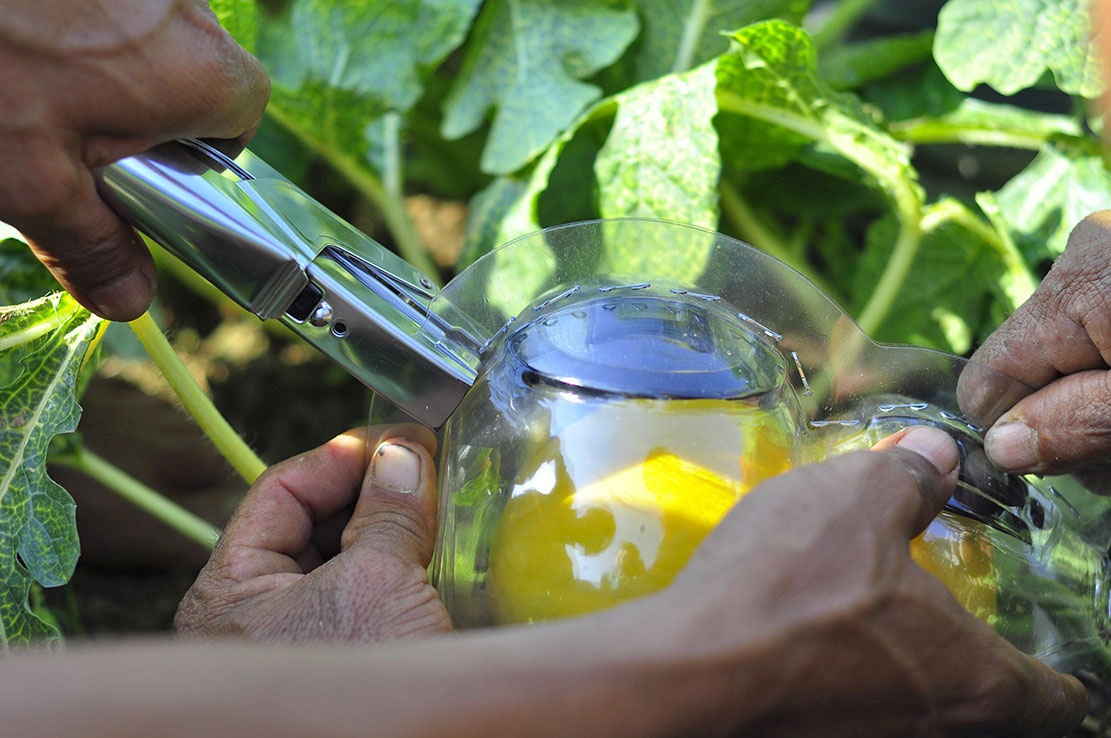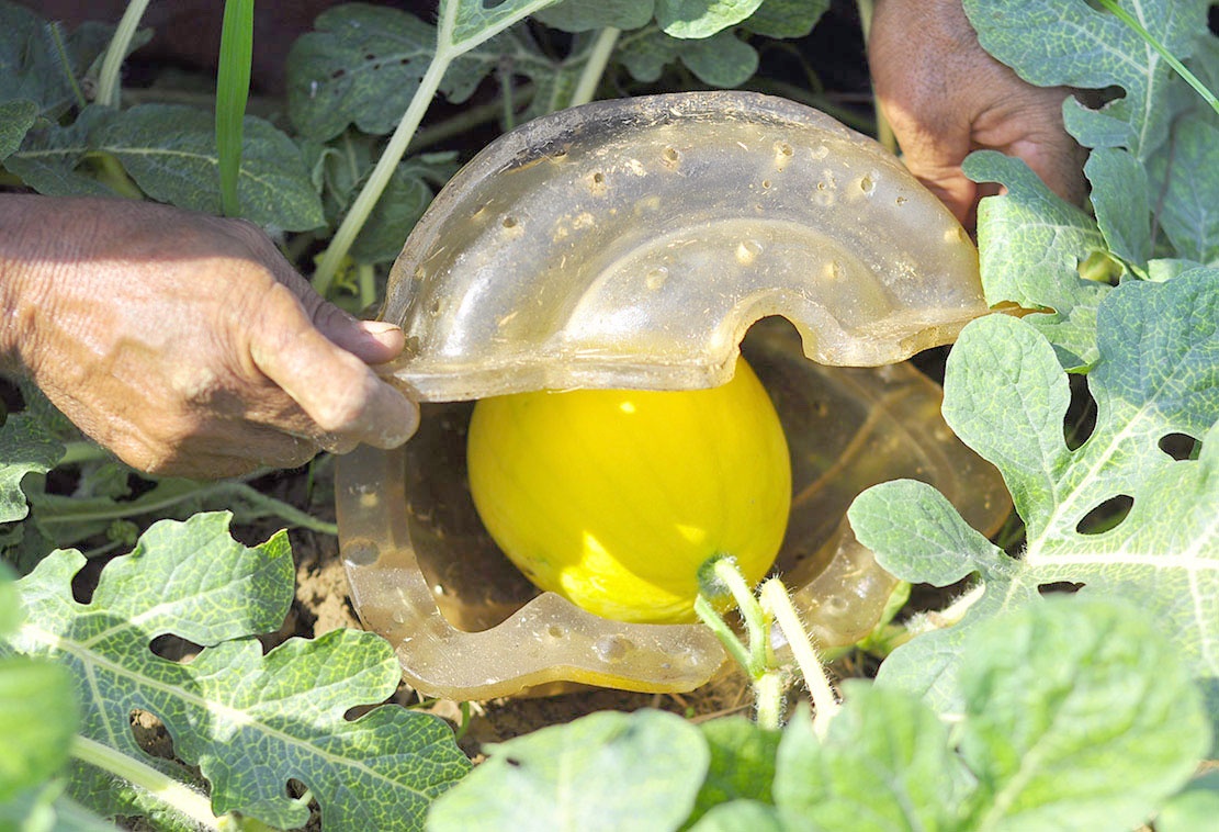 Theo anh, dưa vàng bán Tết thông thường giá trị không cao nên anh áp dụng các phương pháp tạo hình trên quả. Mỗi quả được cho vào khuôn hồ lô, thỏi vàng, trái tim... để tạo hình. |