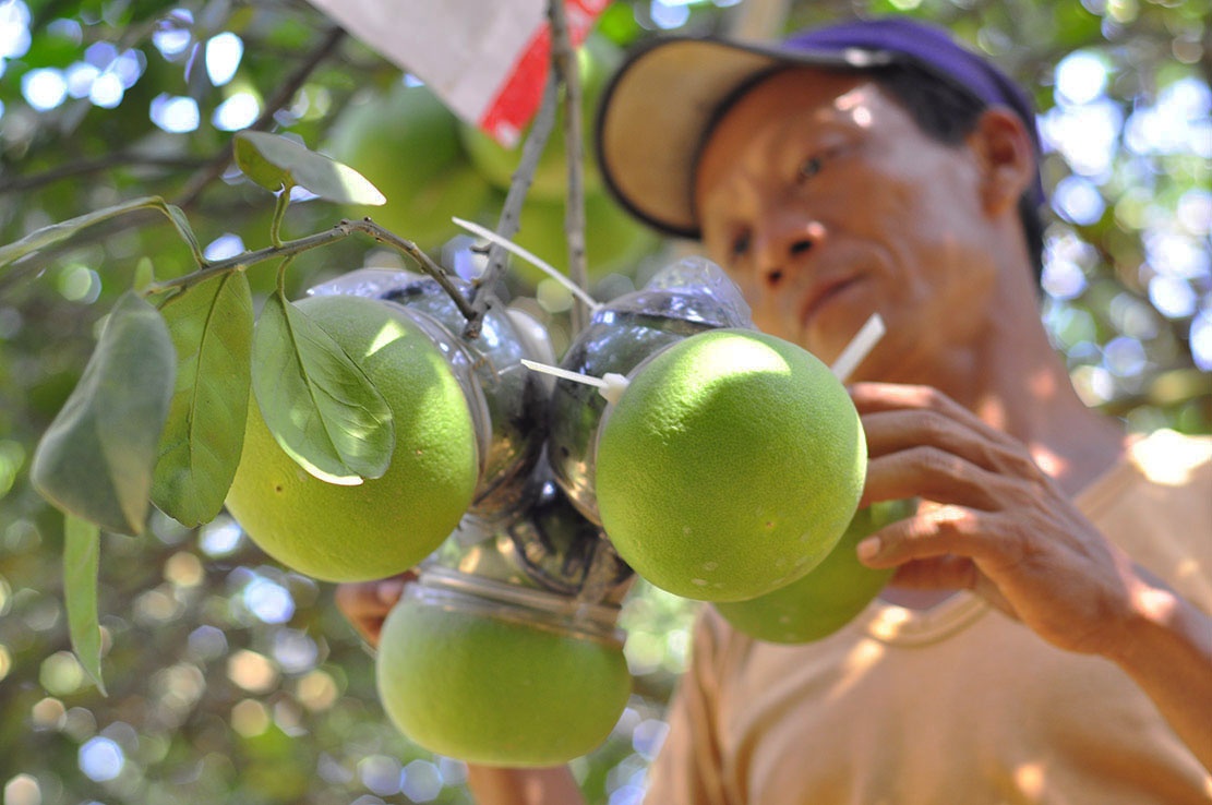 Nông dân này còn đang canh tác 2 ha bưởi da xanh, đường lá cam. Bưởi cũng được tạo hình hồ lô khắc chữ tài lộc, thỏi vàng để phục vụ Tết. Anh cho biết, vườn bưởi có khoảng 500 quả hồ lô thành phẩm. Giá bán dịp Tết từ 800.000 đồng đến 1,2 triệu đồng/quả. Riêng chùm 4 quả tài lộc có giá 12 triệu đồng. "Hàng làm ra không đủ cung ứng thị trường. Từ lúa, bắp, dưa đến bưởi đều có người TP Biên Hòa (Đồng Nai), TP HCM, Hà Nội... đặt hàng từ cuối tháng 10 âm lịch", anh Sơn chia sẻ. |