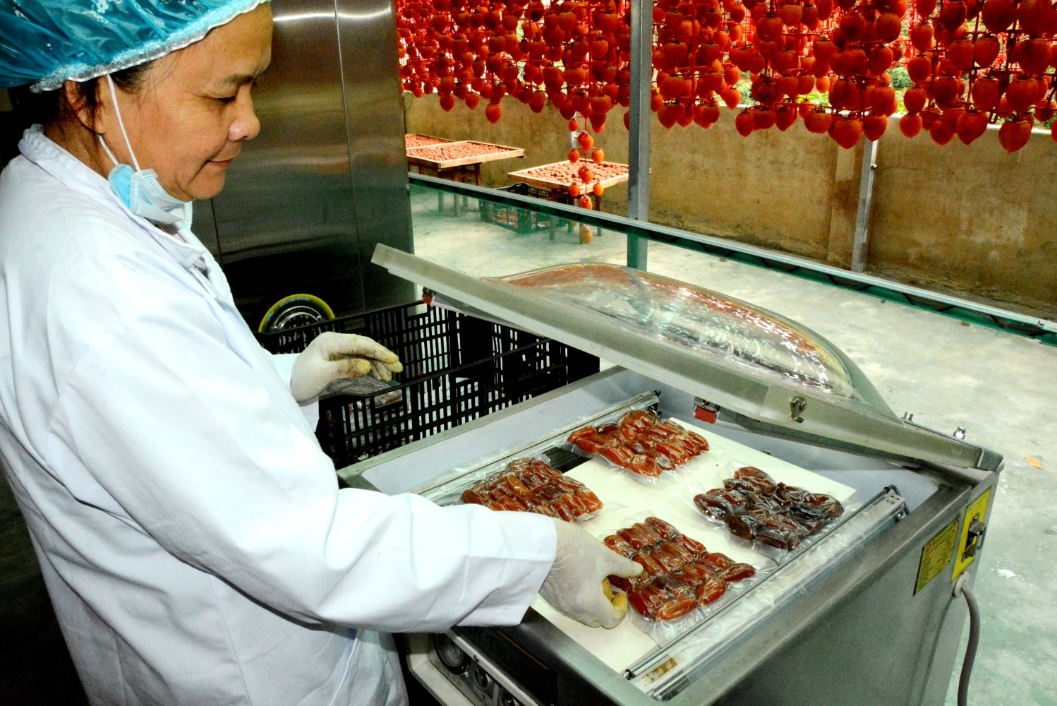 Sau khi được đóng bao, hồng sấy được cho vào máy hút chân không để bảo quản được lâu, tăng độ mềm dẻo cho sản phẩm. |