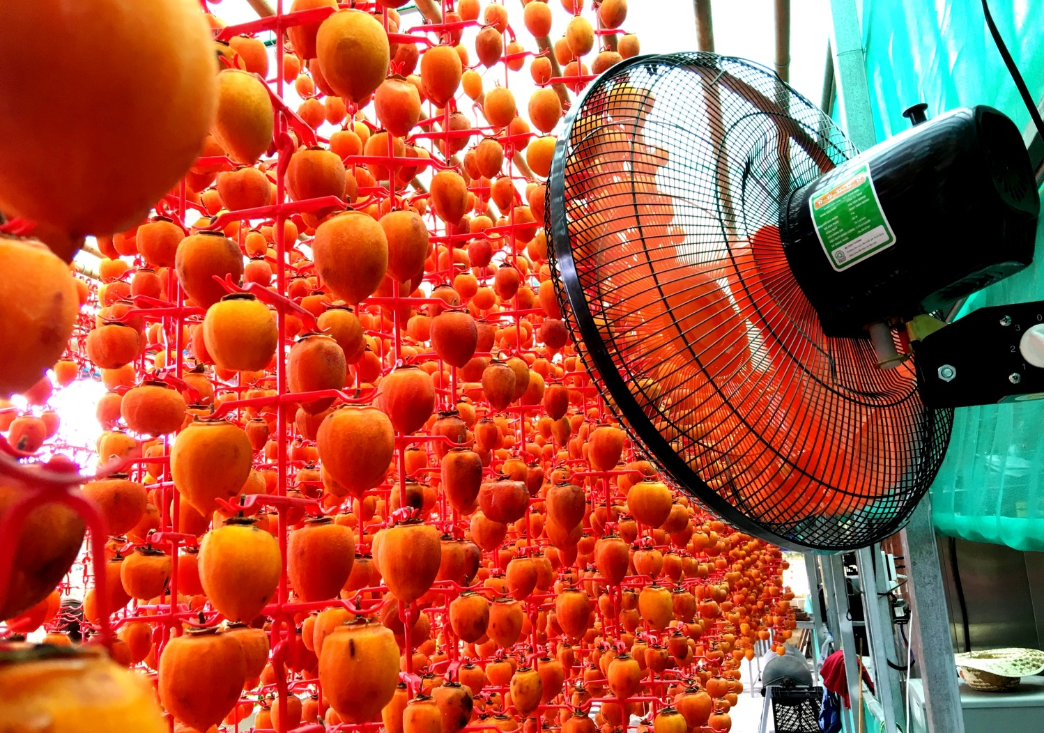 Hồng được sấy bằng nắng, gió tự nhiên có thêm quạt hỗ trợ. Theo bà Vân, làm hồng theo phương thức này phụ thuộc rất nhiều vào thời tiết. Nếu sấy đúng vào thời điểm mưa kéo dài, hoặc nóng ẩm thất thường, độ nóng không đạt thì hồng sẽ bị chảy nước, lên men. |
