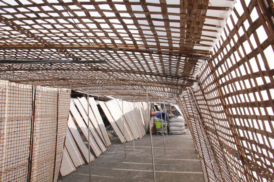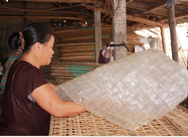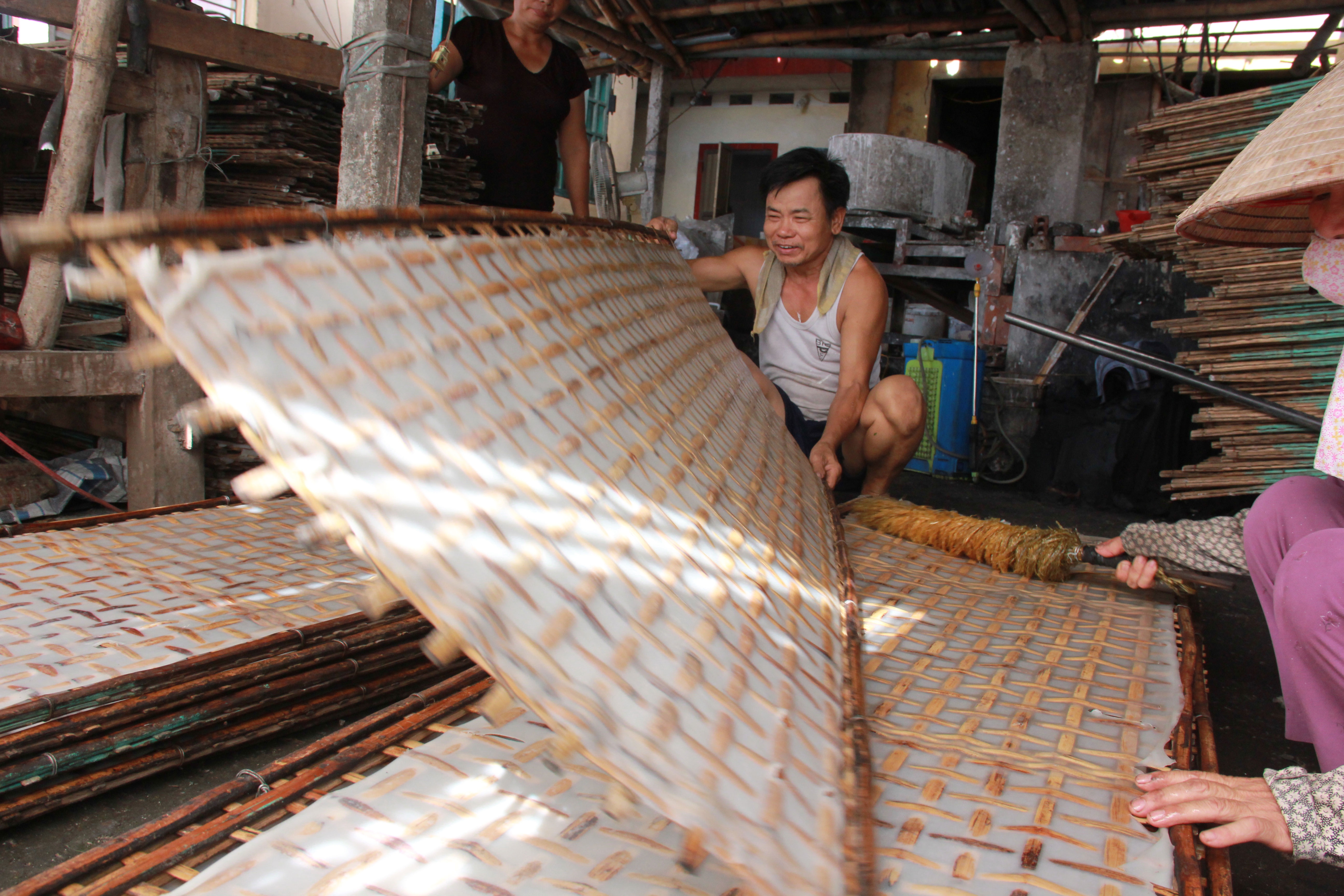 Bánh đa sau khi ra lò sẽ được đặt lên phên để phơi. Ngoài tận dụng khoảng không gian của gia đình, bà Thuyên phải chở bánh đem phơi ở ven đường hoặc cánh đồng.